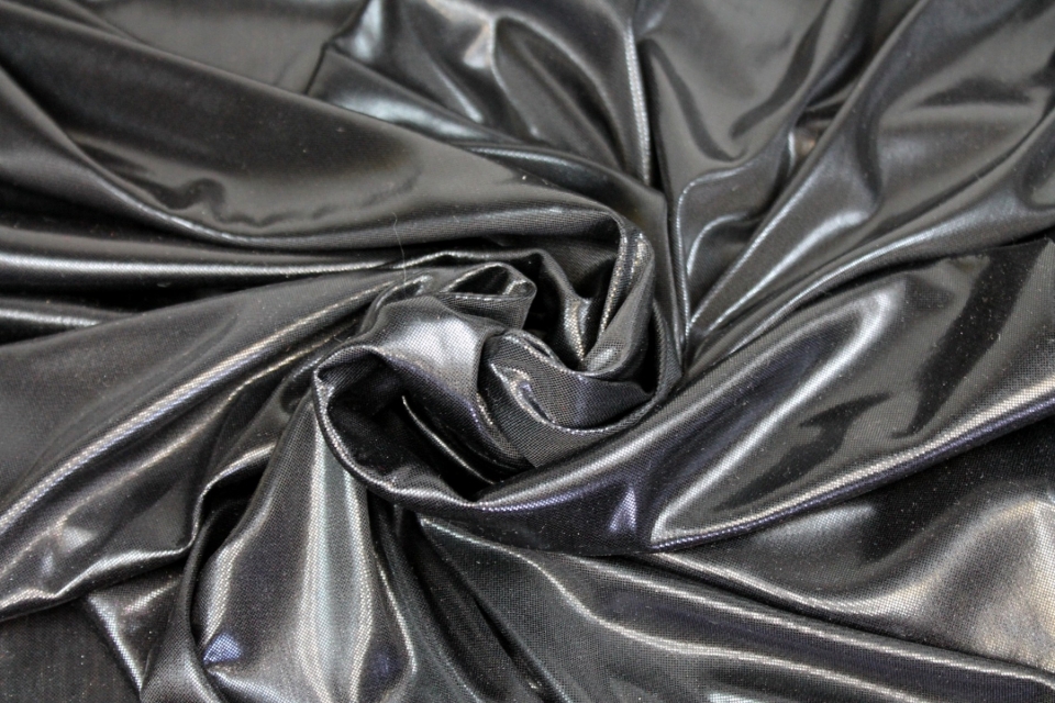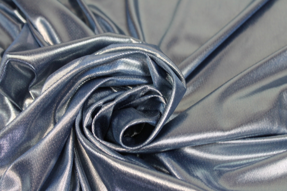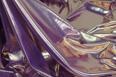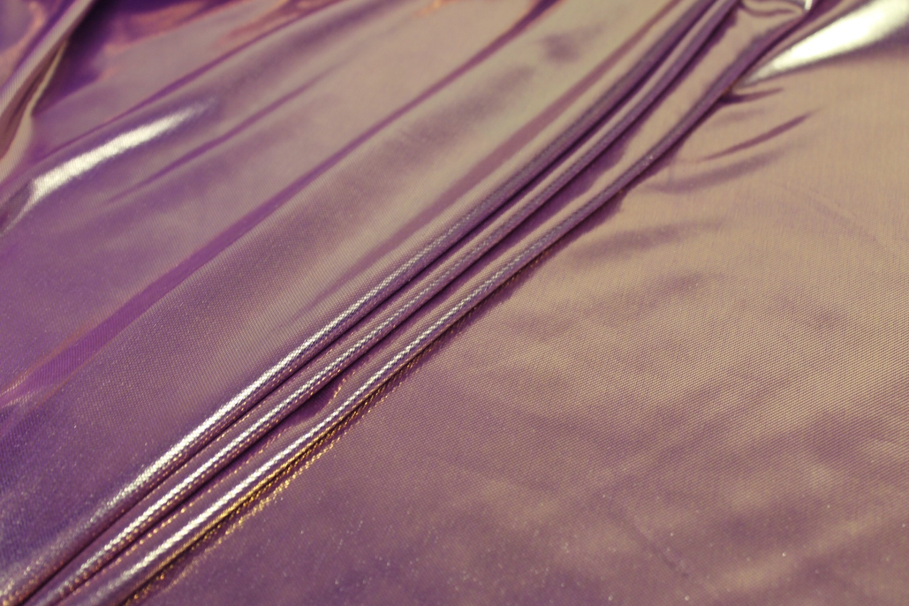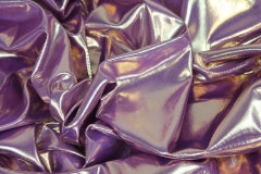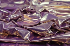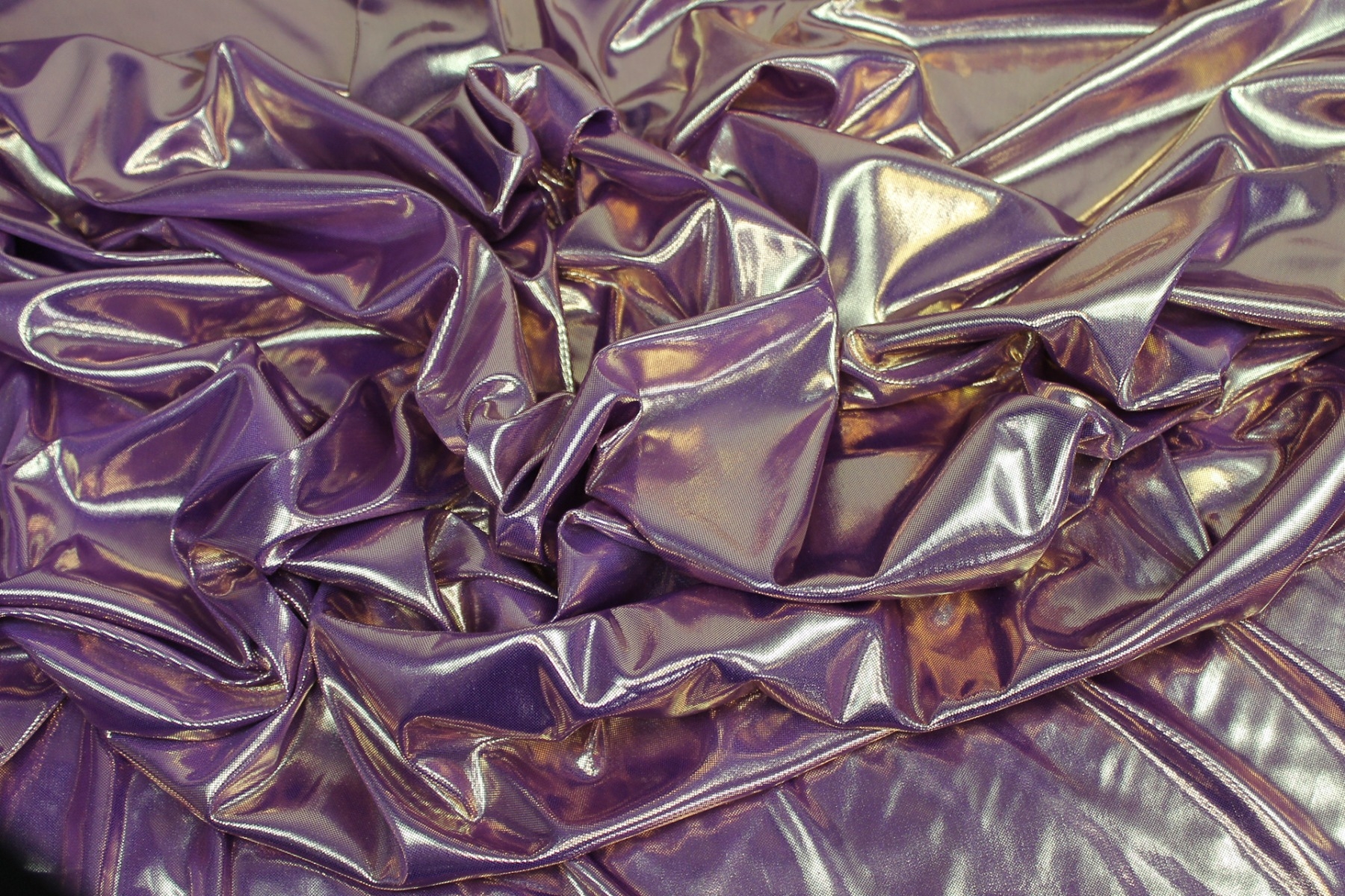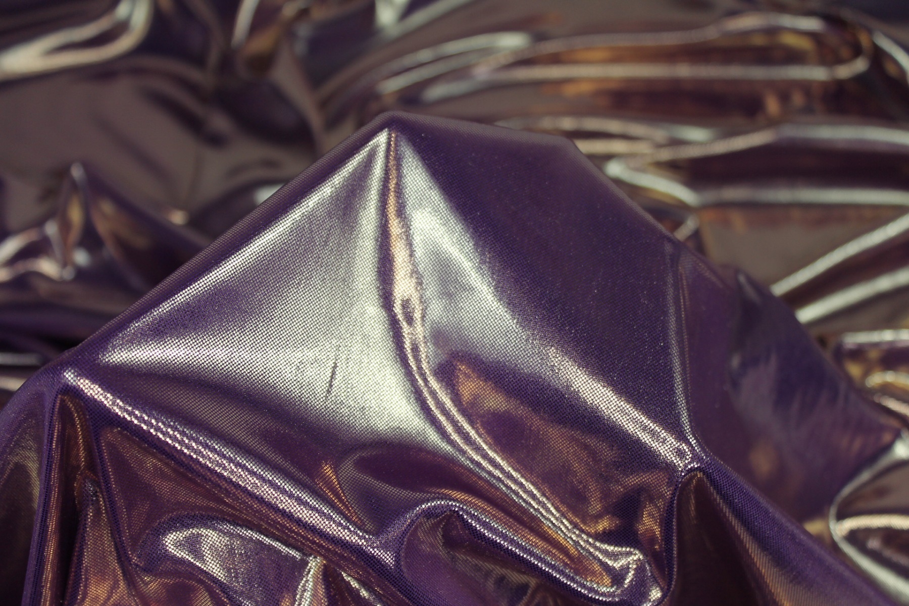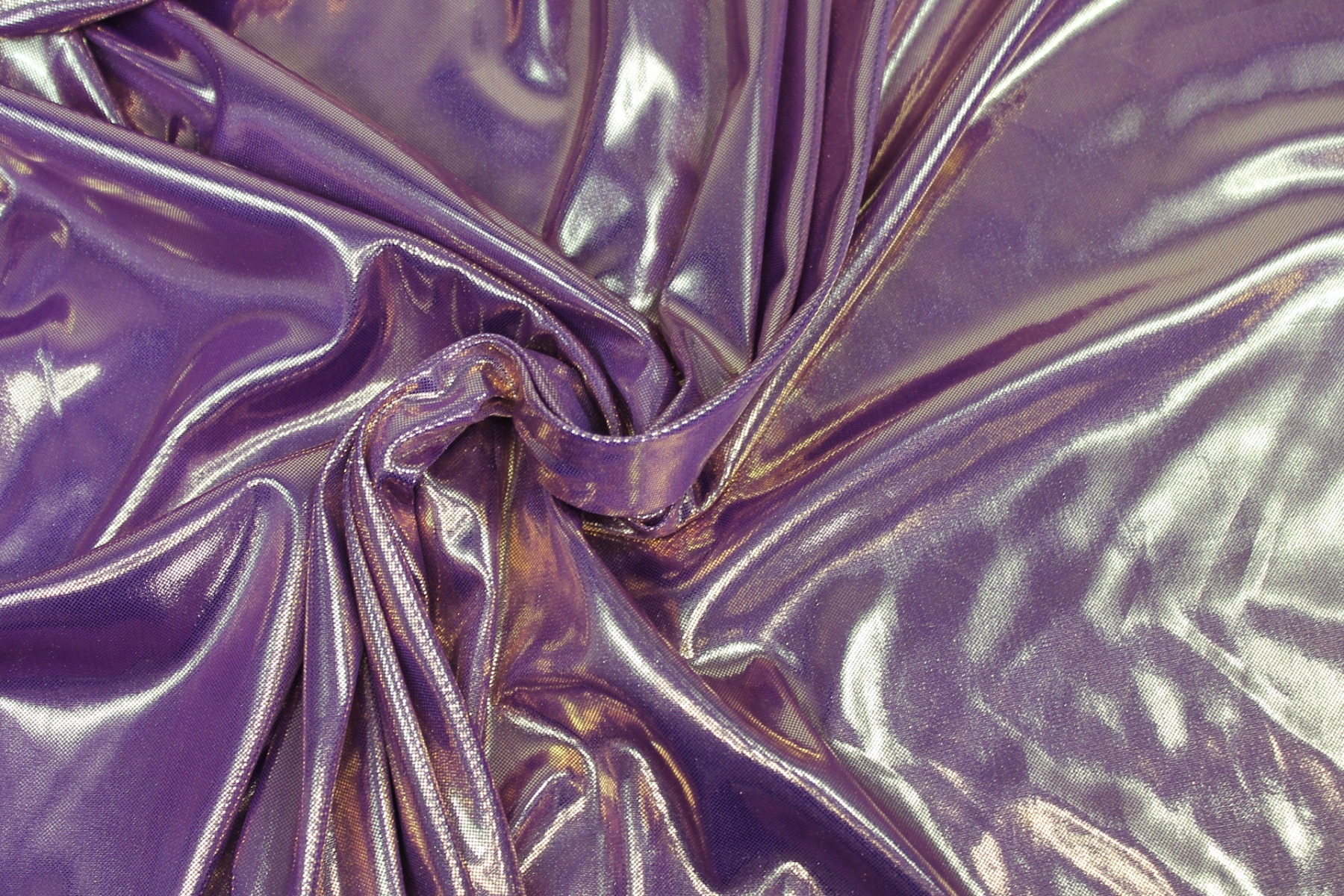 This is an inexpensive foiled nylon jersey in purple with a metallic gold foil finish in a tiny dot pattern. It has great drape but isn't extremely stretchy. 110cm wide, great for fancy dress.
