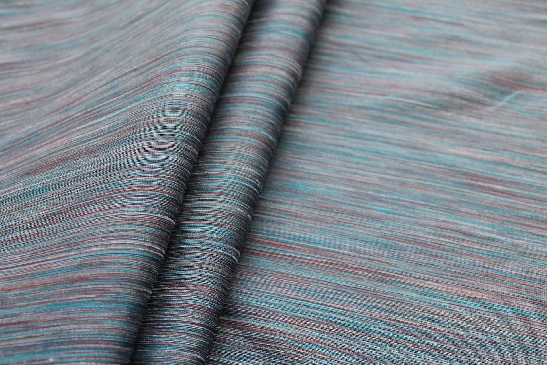 This is a marl silk dupion type fabric, woven with a multitude of coloured weft yarn on a black warp. This one is a blue, pink, white and grey weft on a black warp. 100% polyester, but feels and looks like silk.