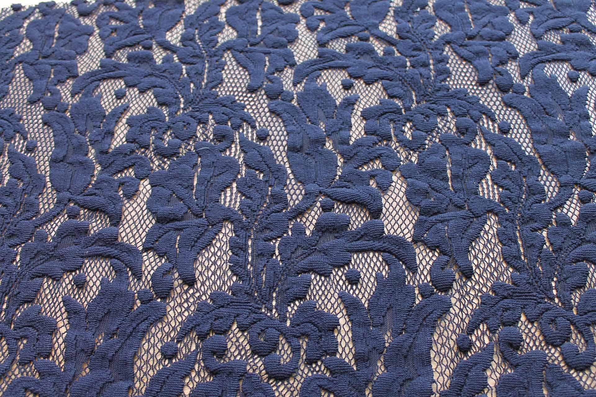 An inexpensive navy lace with a swirly pattern on a fishnet base. This European made lace has no scalloped edges. 150cm wide.