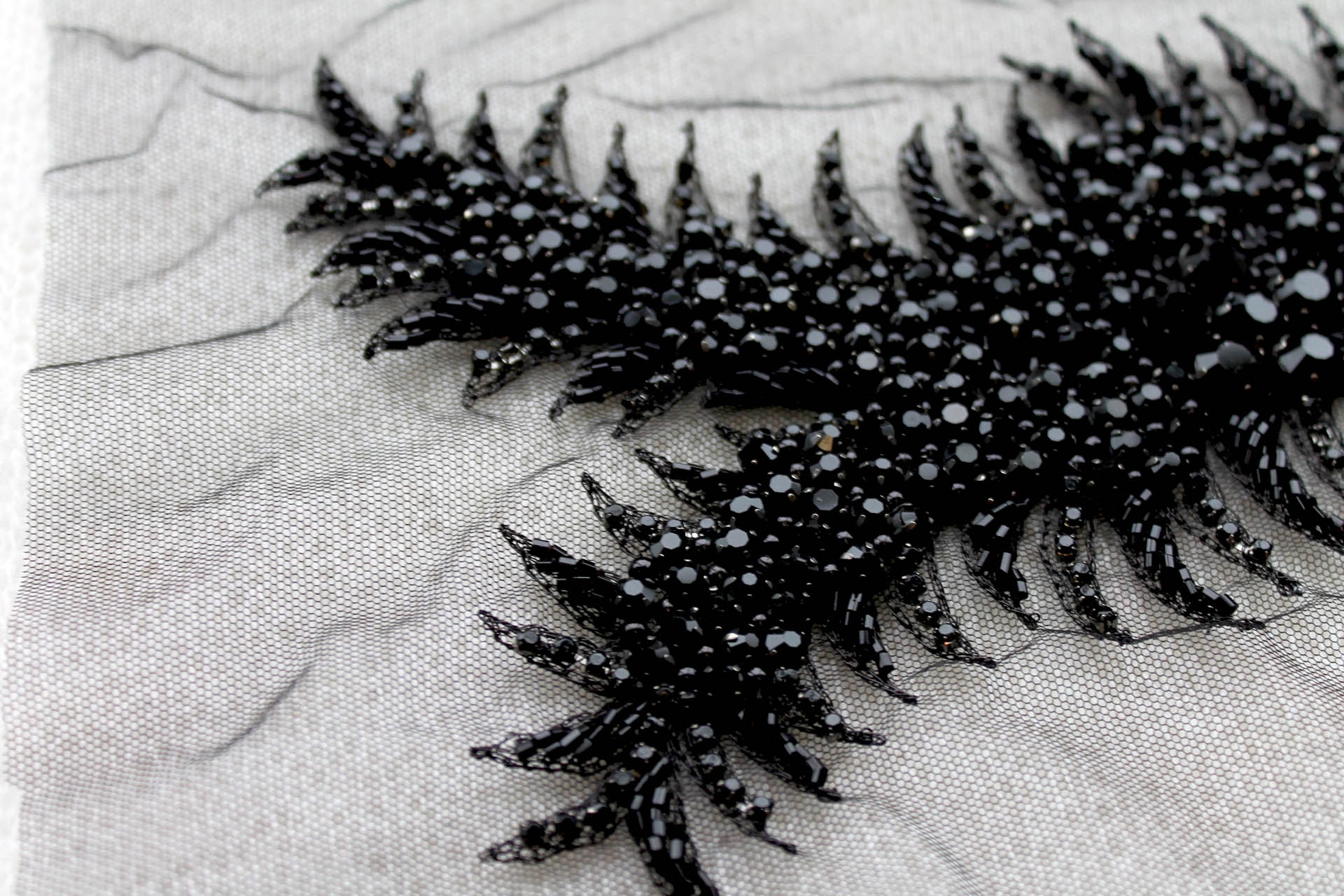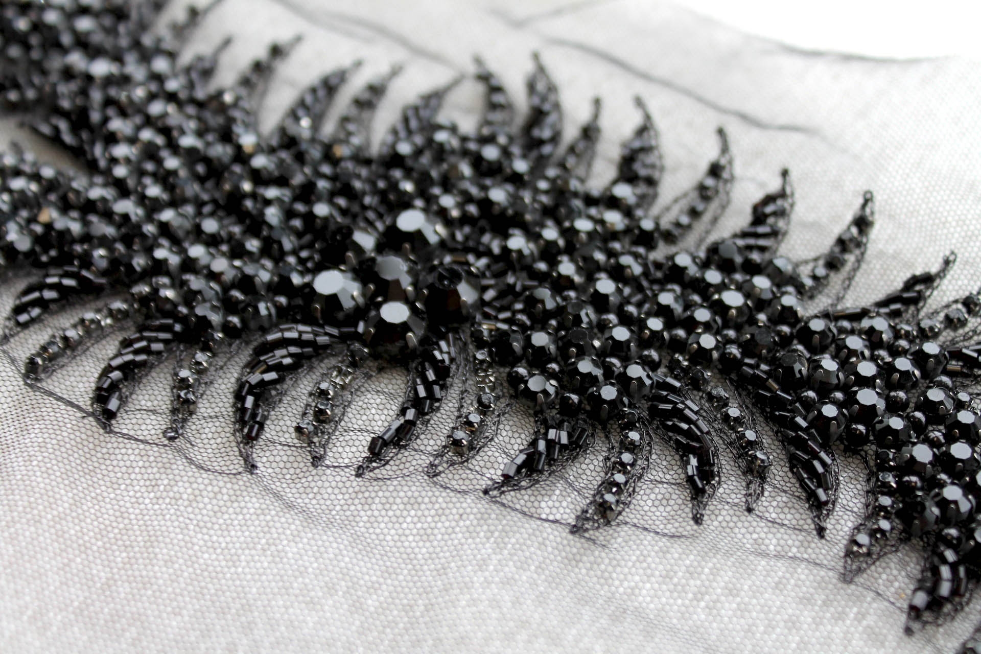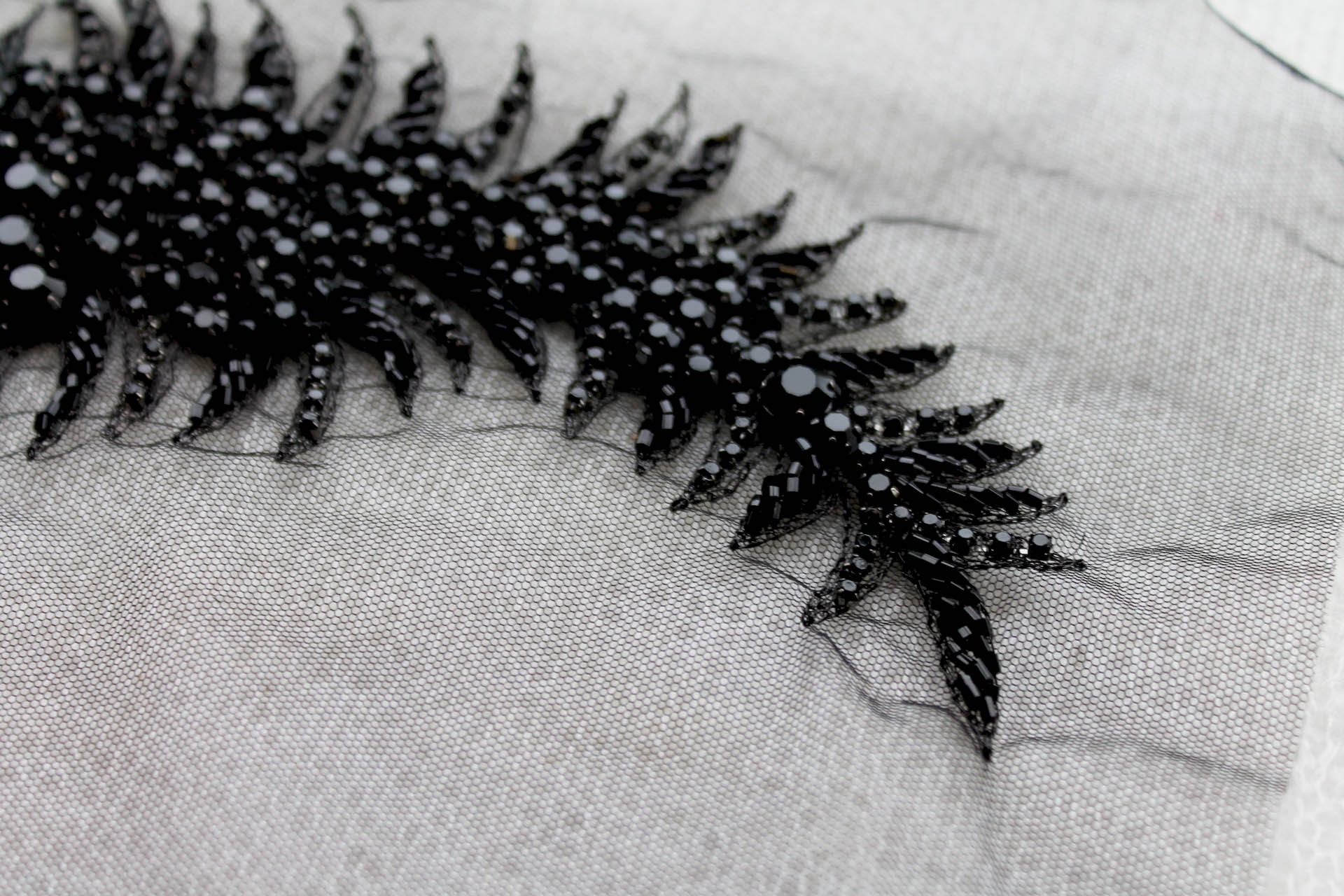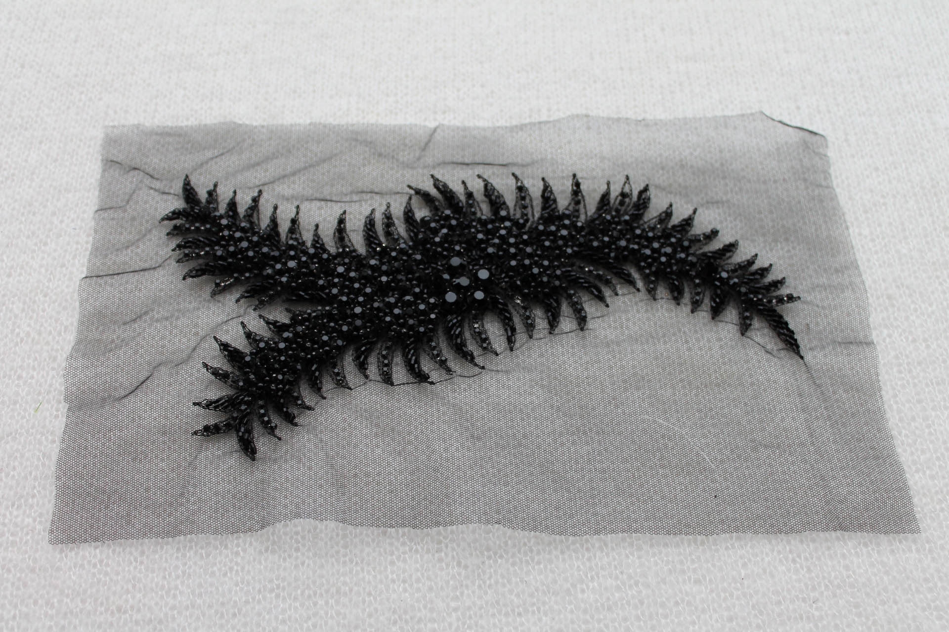 A gorgeous vintage style black diamante motif which has been hand beaded with black seed and bugle beads and high quality black cut glass crystals.