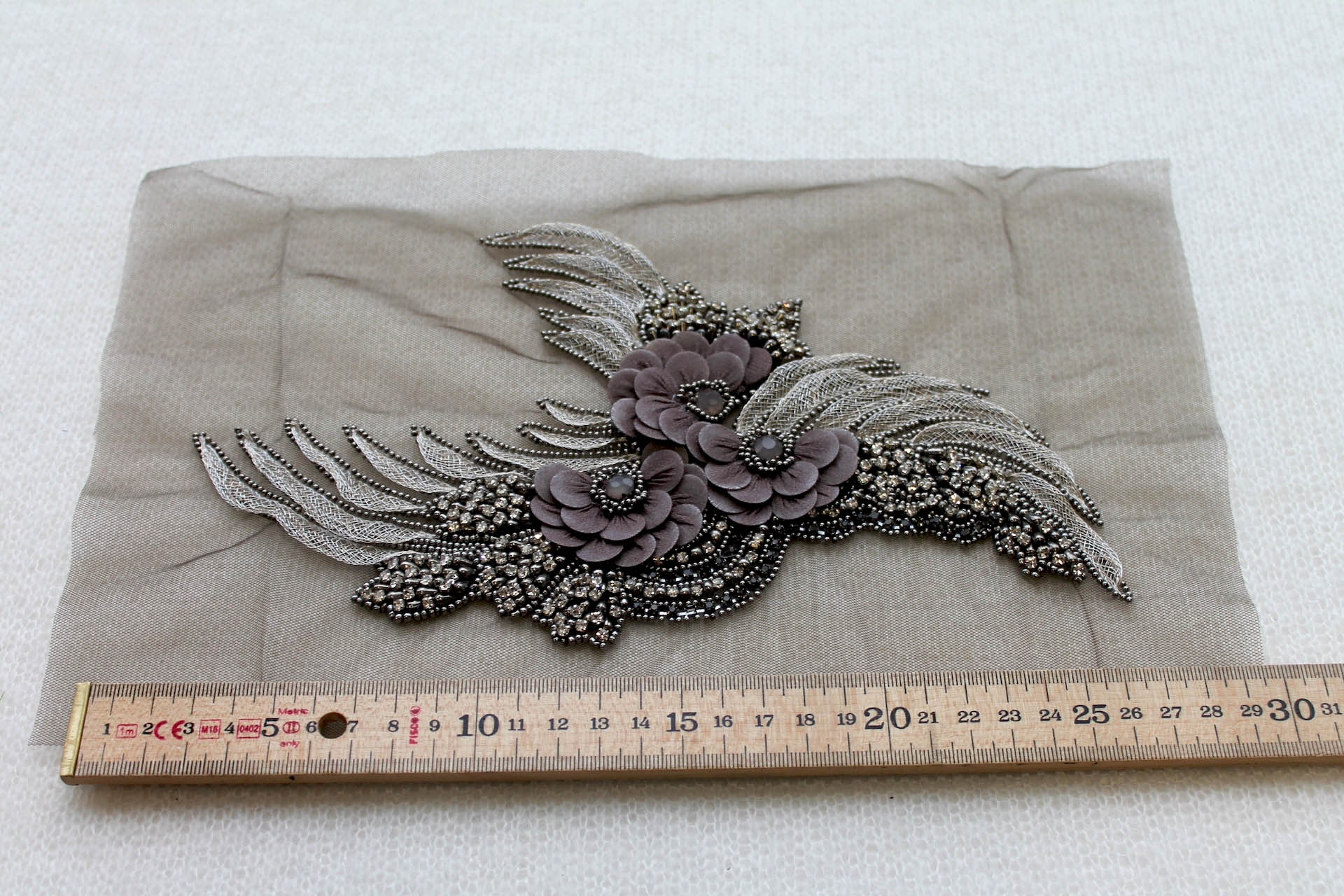 A gorgeous vintage style grey and silver diamante motif which has been hand beaded and embellished with silver thread, glass beads and crystals, and flowers made with petals formed from silk georgette covered sequins, finished with cut glass crystals.