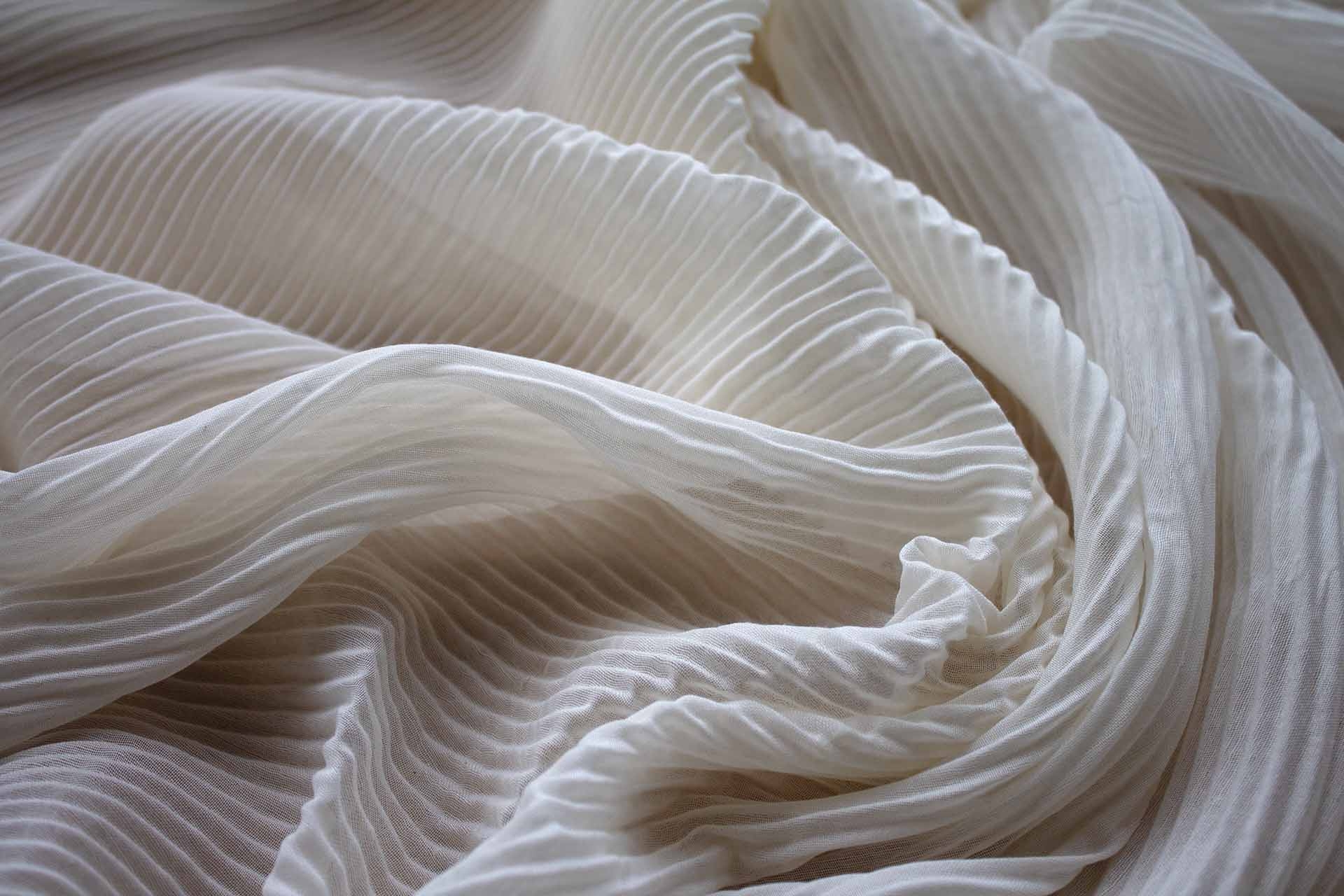 A creamy off white sheer and soft polyester fabric that has been finely pleated in 2-3mm crystal pleats from selvedge to selvedge.