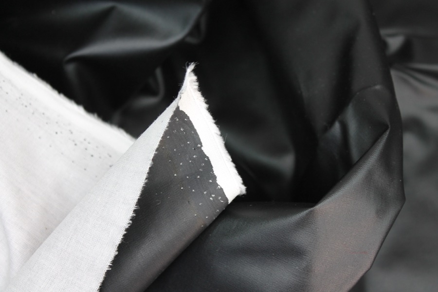 This poly-cotton blend tech fabric is coated in black polyurethane for added shine. Water repellent, made in Europe. Black, almost a bit rubbery. 140cm wide.