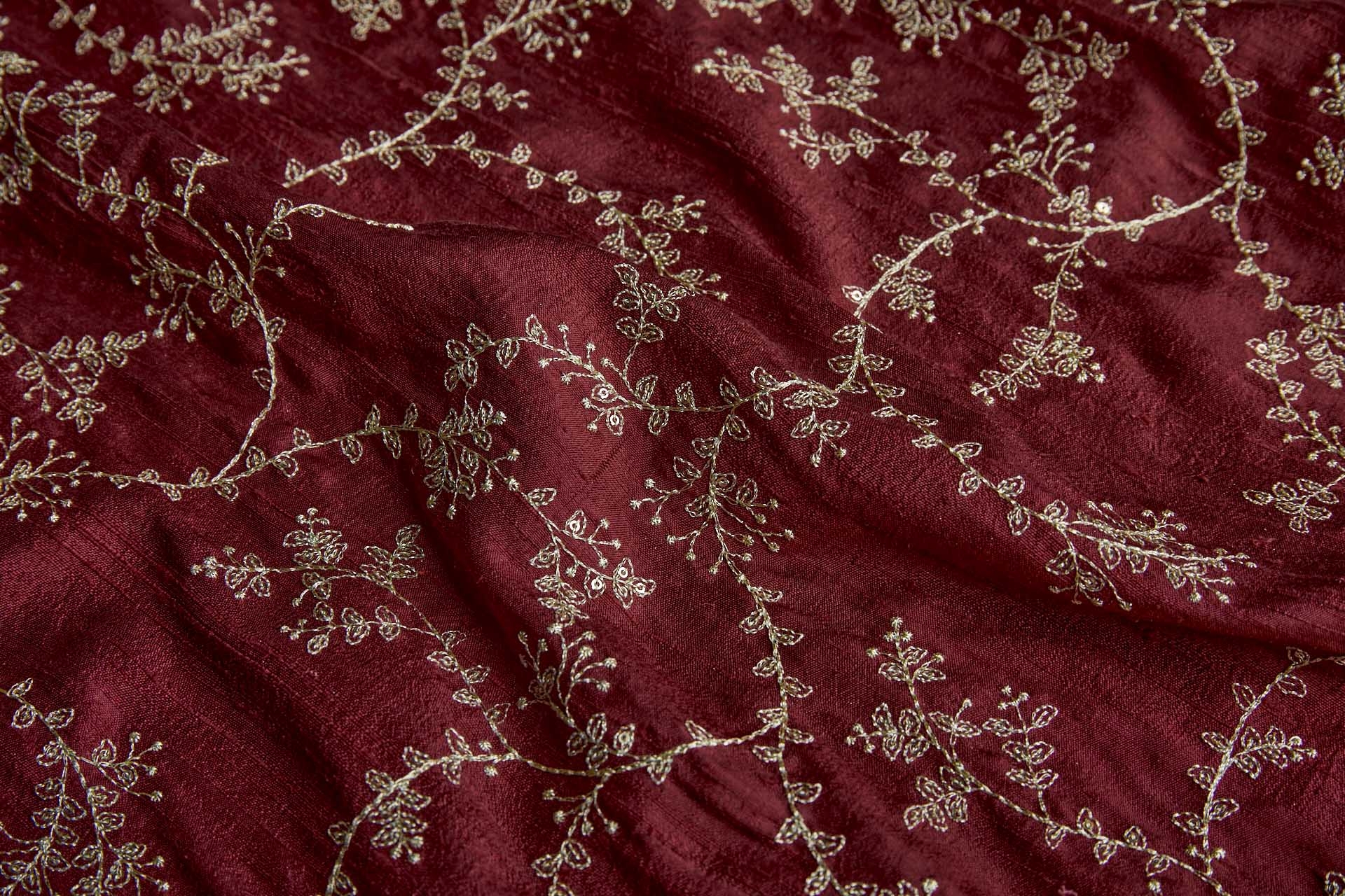 Delicate Gold Thread and Sequin Embroidery on Wine Red Silk Tassar / Tussah