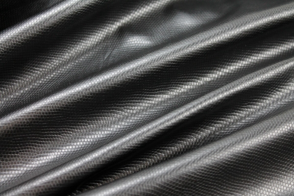 This is a light weight PU coated fabric, like a PVC or a soft leatherette with a small reptile pattern, in black.