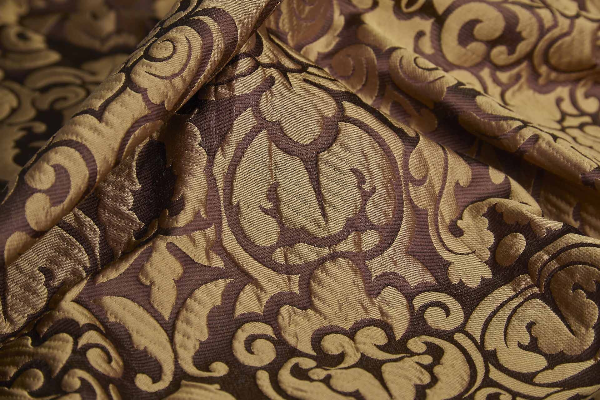 Beautifully sumptuous, this European made "Cloaquė" brocade in maroon and rich gold features a large scale blistered scroll and leaf pattern.