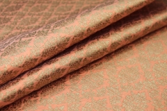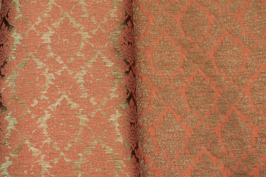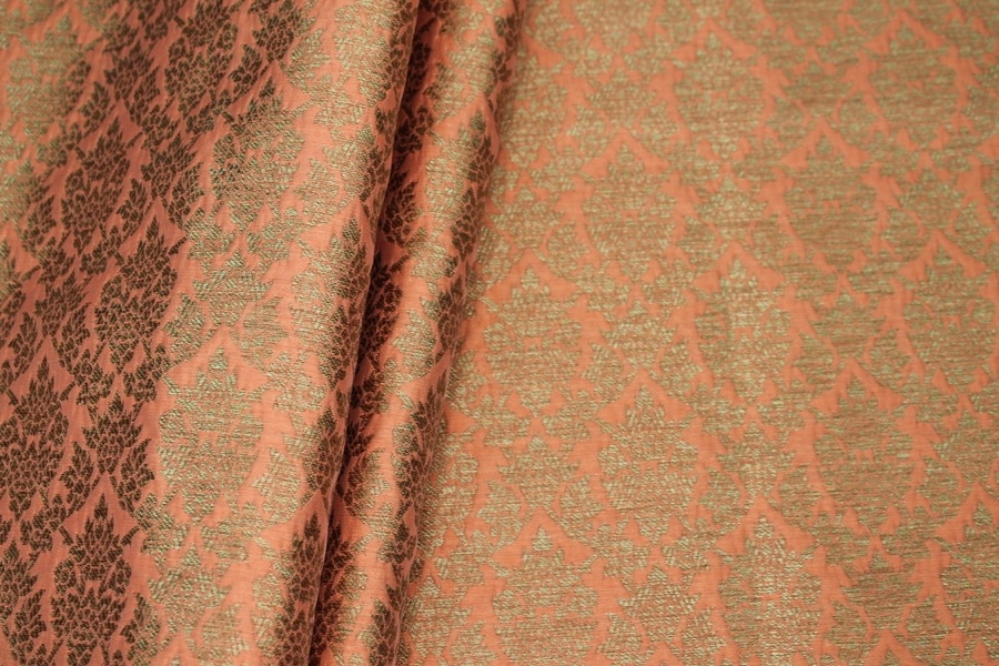 Poly-viscose mix brocade, hand loomed in India. Features a simple but ornamental design in peach and gold, no metallic thread. The design is somewhat reversible, see all images.
