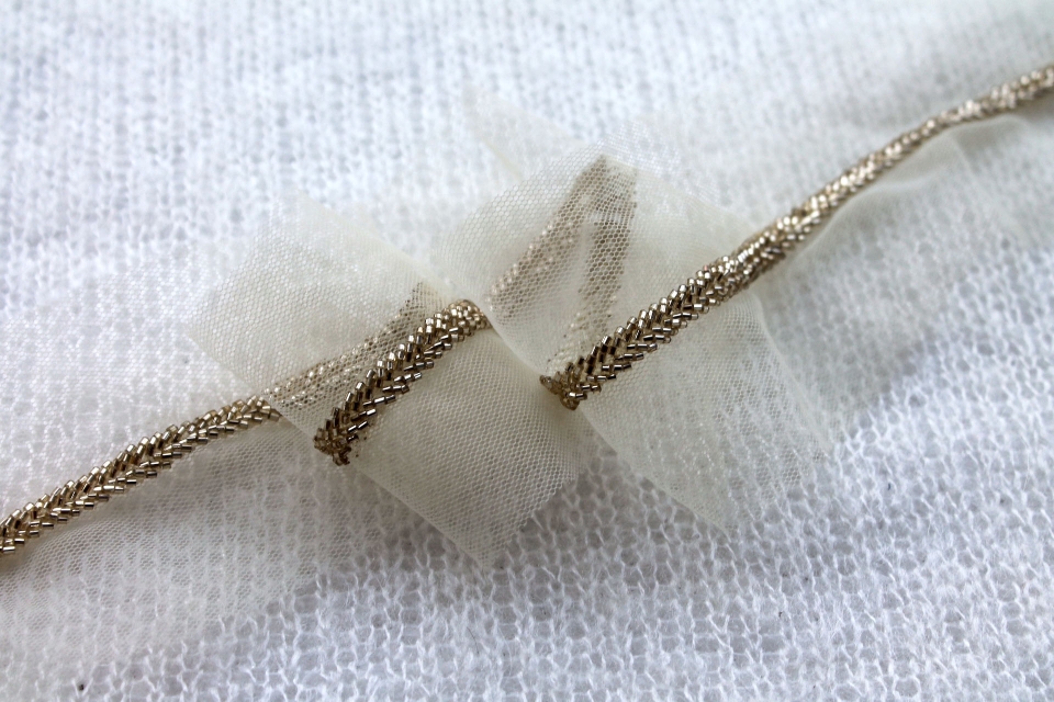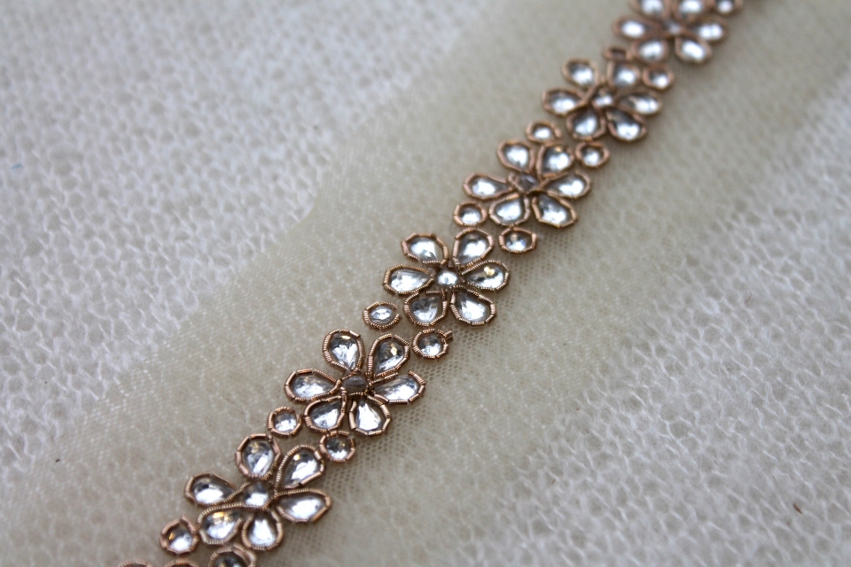 A pretty vintage style pearl and metal work trim with a leaf pattern in gold metal and ivory pearls.