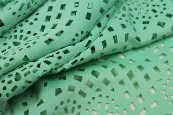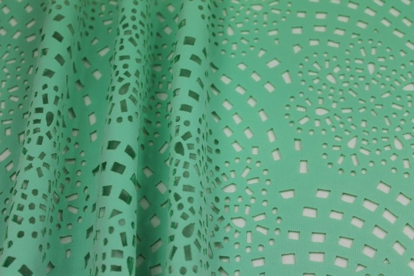 This is a soft quality scuba jersey with a laser cut snowflake style pattern, in mint green.
