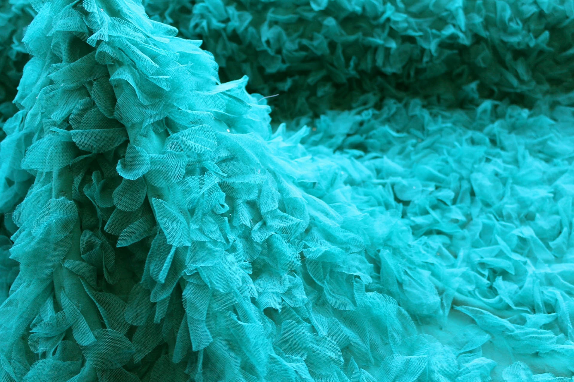 Peacock green nylon tulle, cut into petals or teardrops, hand sewn onto a silk chiffon, with a matching sequin at the attaching point for added shimmer.