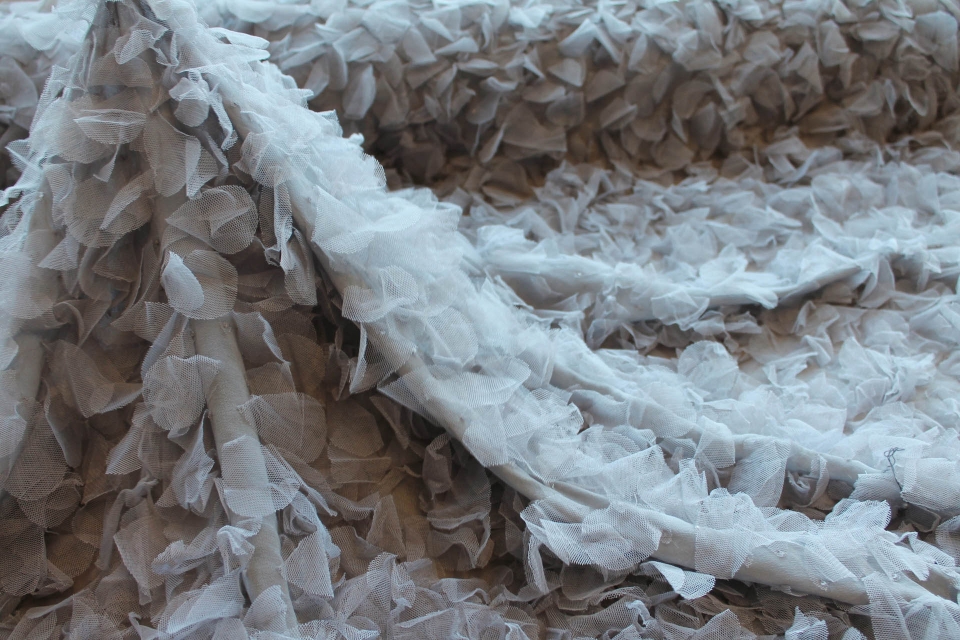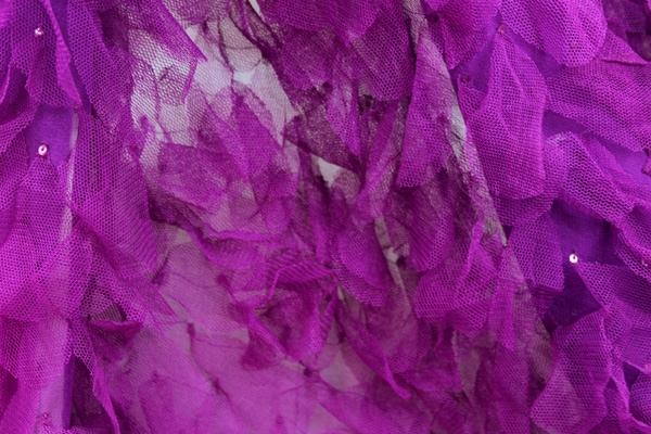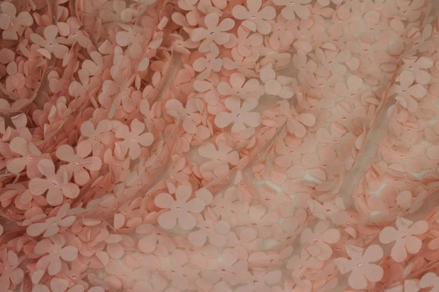 A sheer pale pink tulle base embellished with cut out flowers in a peachy pink georgette, with a tiny but cute scalloped edge. The flowers are about 2.5-3cm wide.