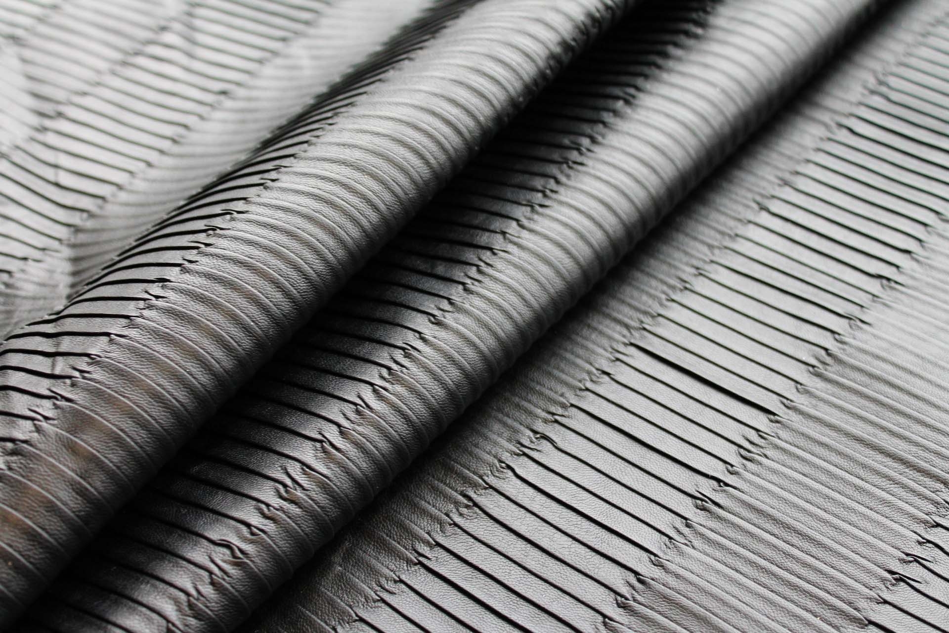 This is a soft glove weight leatherette, in black, which has been pleated and then secured with a fusible backing. This makes the pleats into an interesting texture.