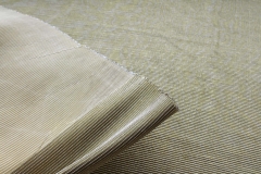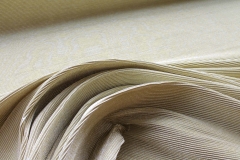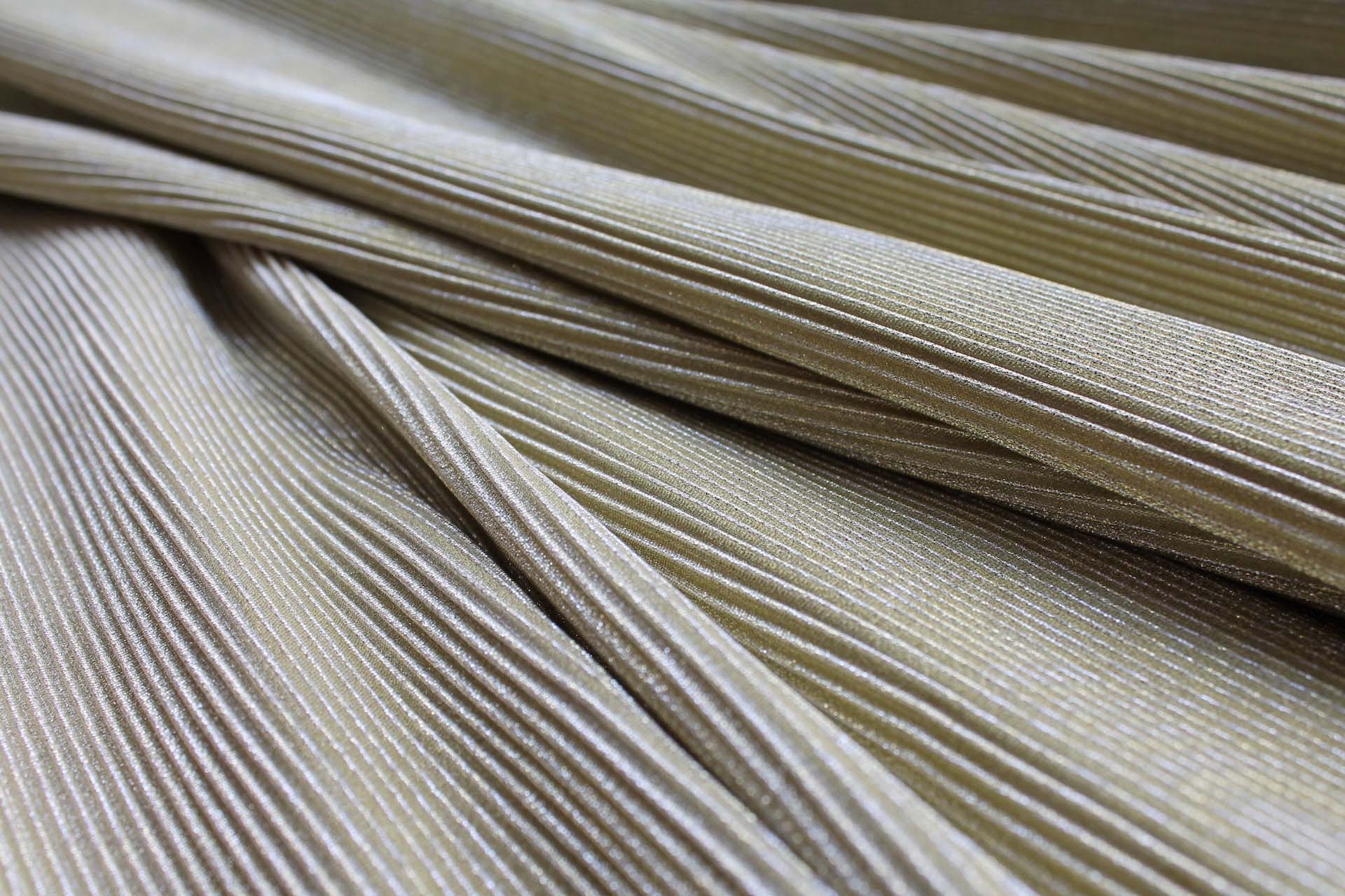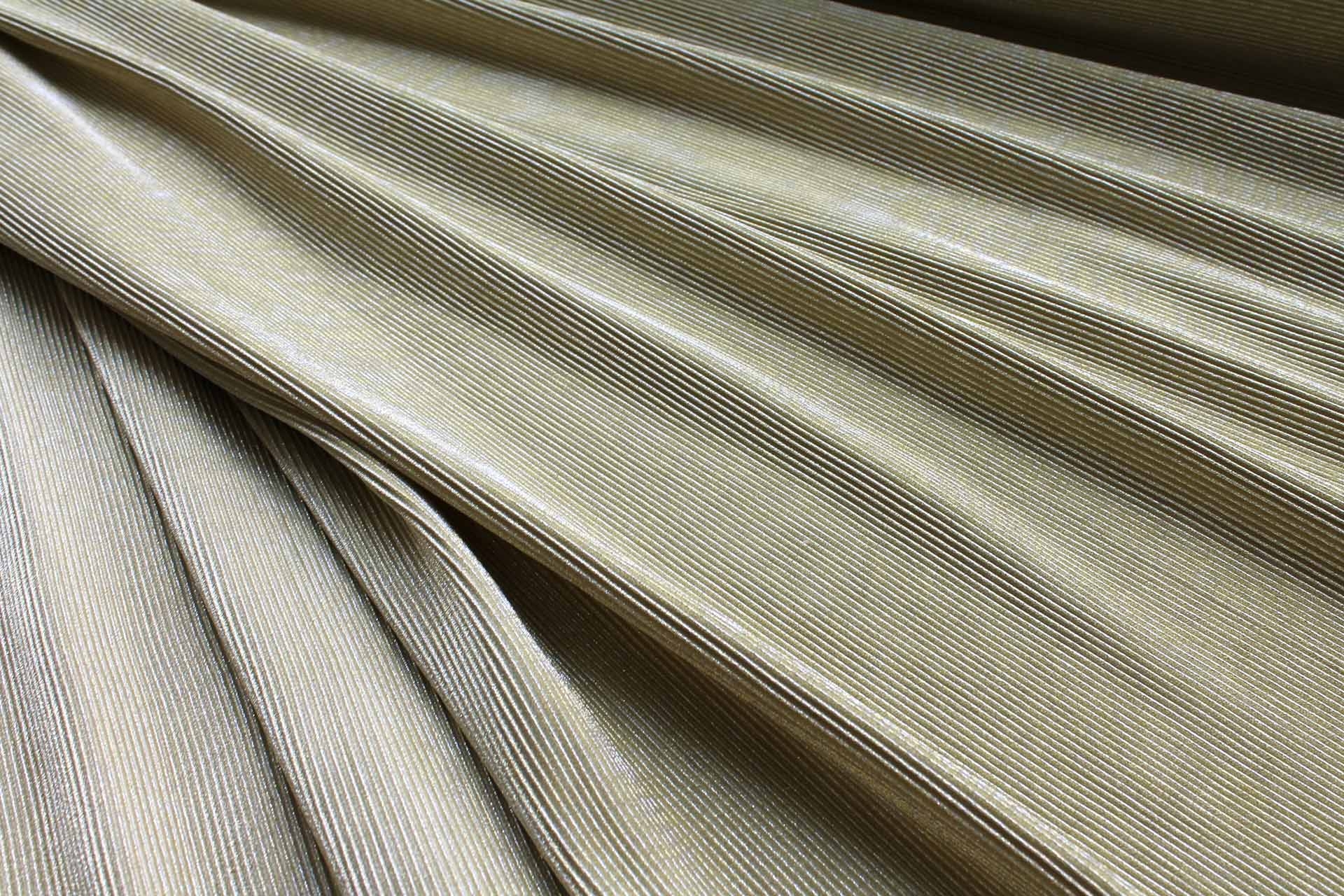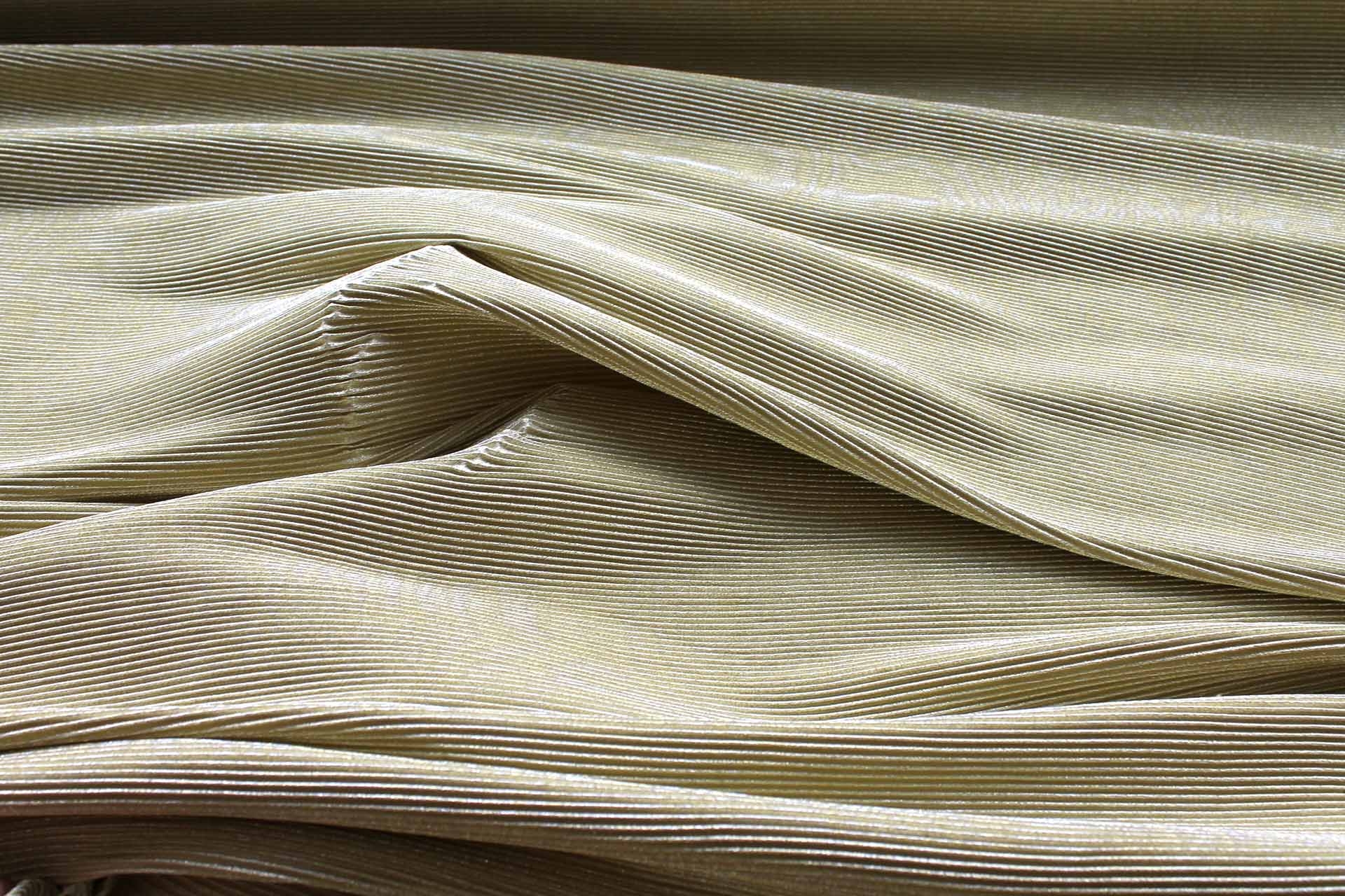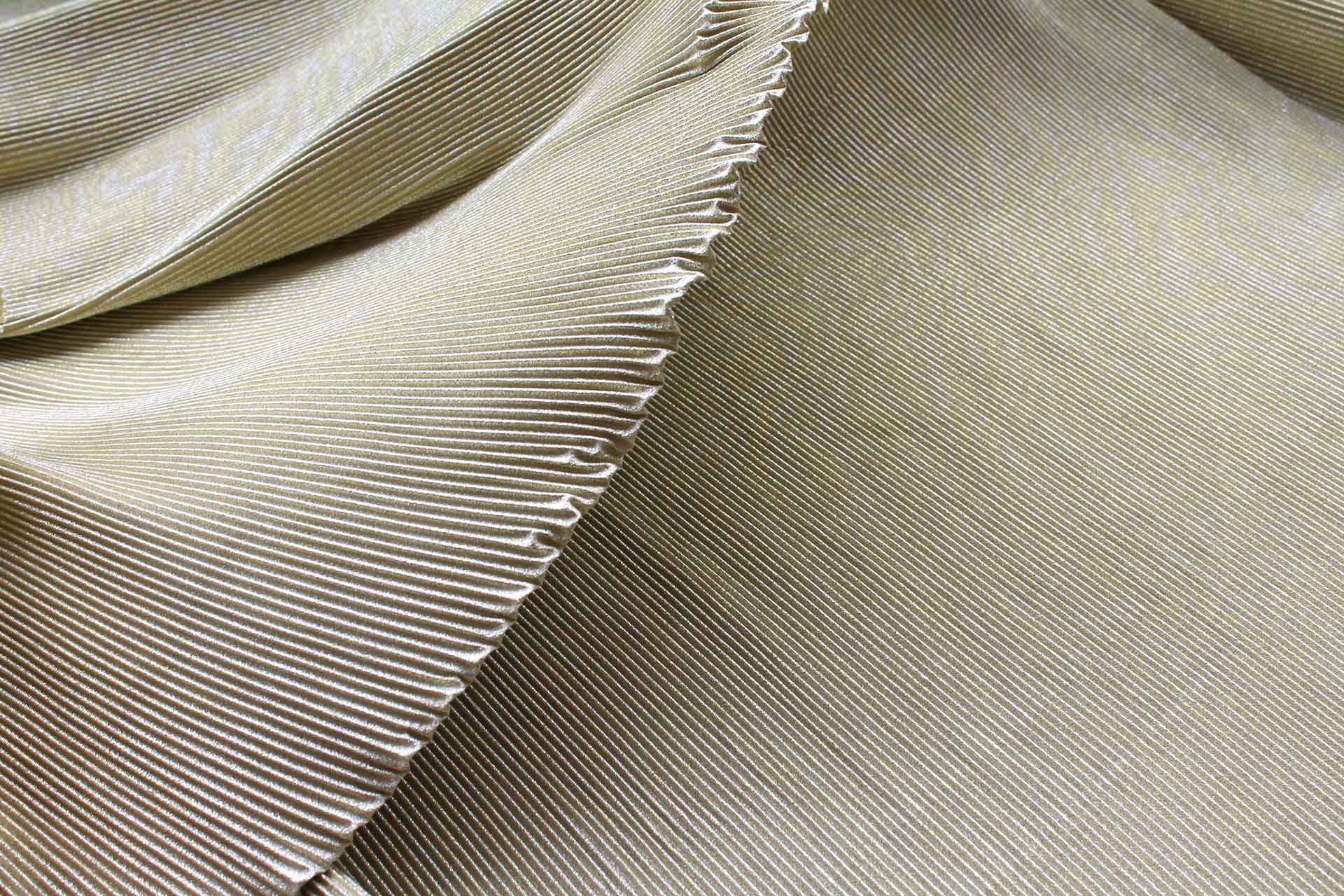 This is a satin weave lurex lamé fabric that has been finely pleated in 2-3mm crystal pleats from selvedge to selvedge. 135-140cm wide. One side more gold with the lurex, the other side more yellowy cream.