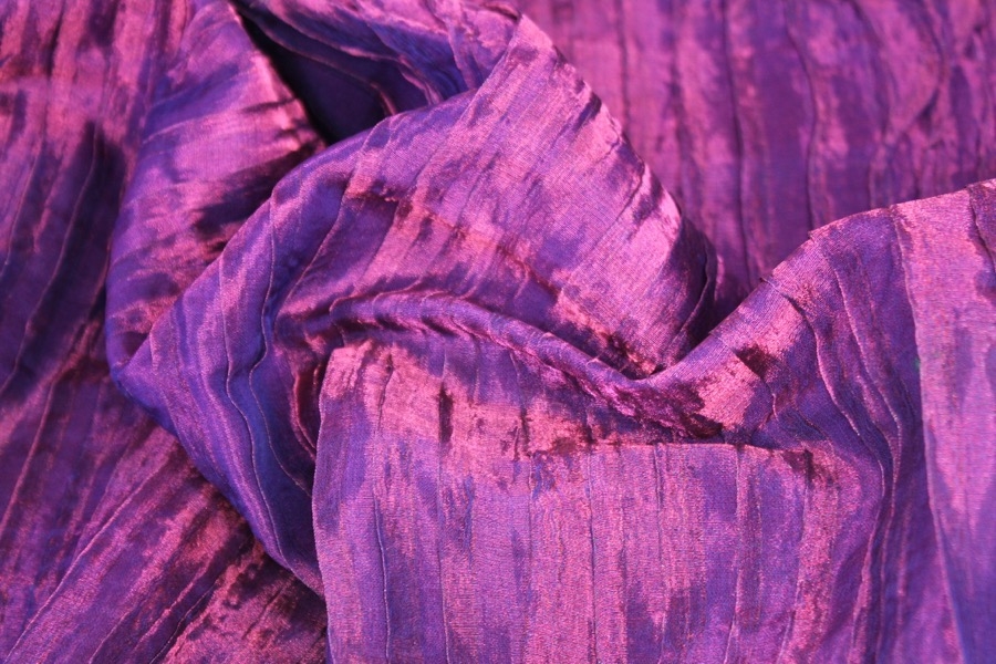 This is a silk metal organza in magenta shot purple, pleated and pintucked onto a cotton backing. The overall colour of the fabric looks like an African violet colour.