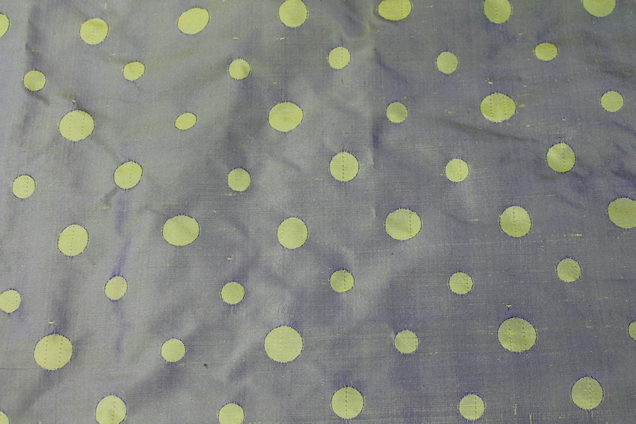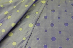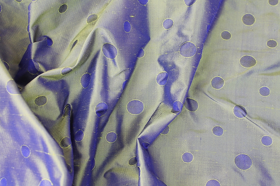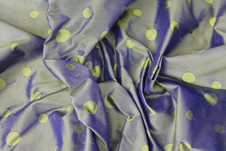 This is a silk dupion with woven spots in assorted sizes, in royal blue and lime green. It has been woven so it is two tone reversible, blue shot green with green spots on one side, and with blue spots on the other.