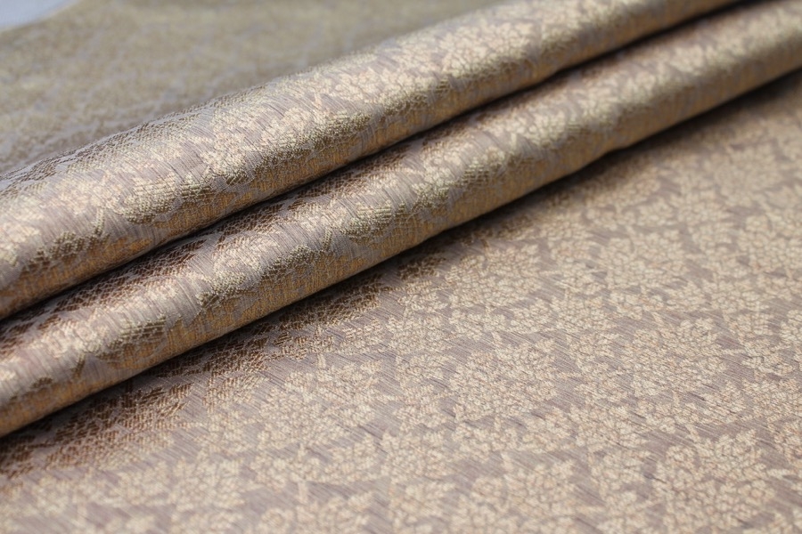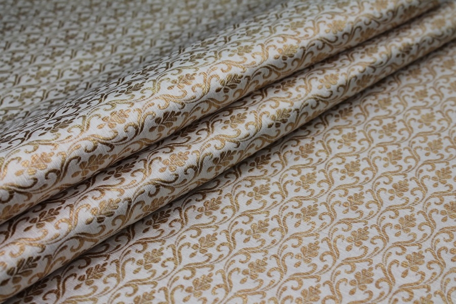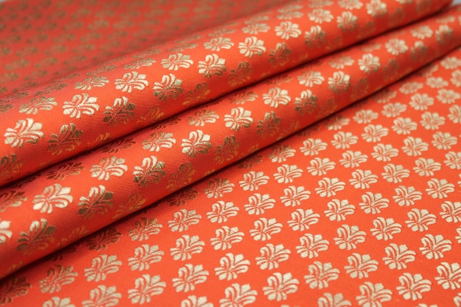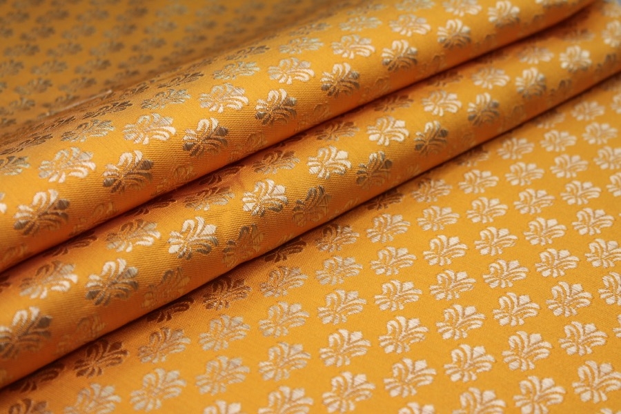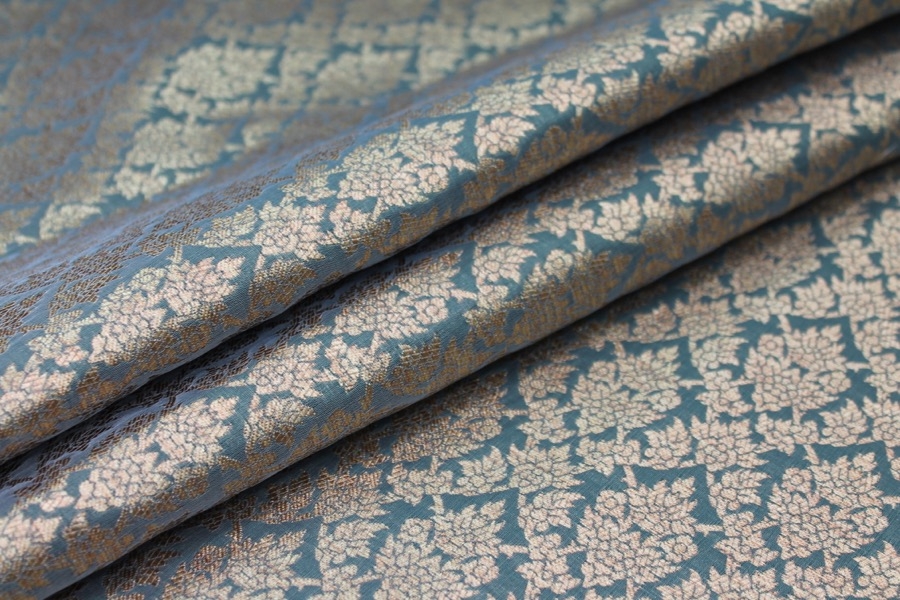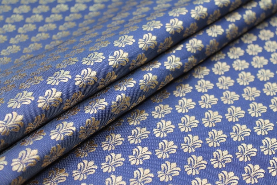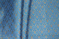 Poly-viscose mix brocade, hand loomed in India. Features a simple but ornamental design in bright blue and gold, no metallic thread. The design is somewhat reversible, see all images.