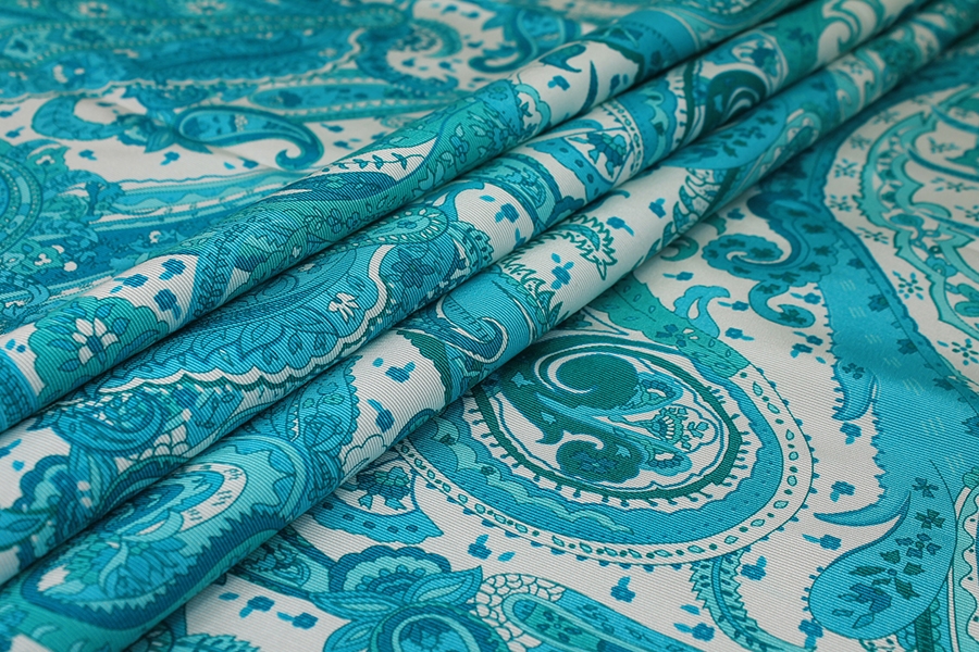 This soft ivory cotton / viscose grosgrain has been printed in a large scale paisley pattern in shades of turquoise. 140cm wide.