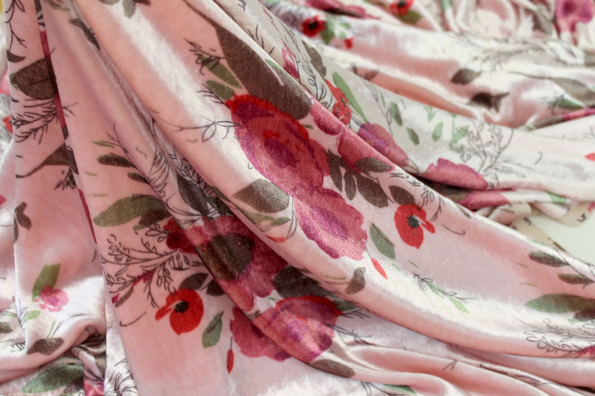 A luxurious, soft, drapey silk velvet composed of a silk chiffon base and a viscose pile, long pile. Pale pink in colour, printed with a pretty floral pattern of poppies and braches with leaves in reds, brown and green. It is 140cm wide. 82% viscose 18% silk, approx 180g per linear metre.