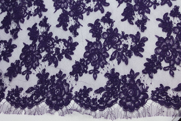 A high quality French corded lace in royal purple. Extra wide, 140cm. Double scallop.