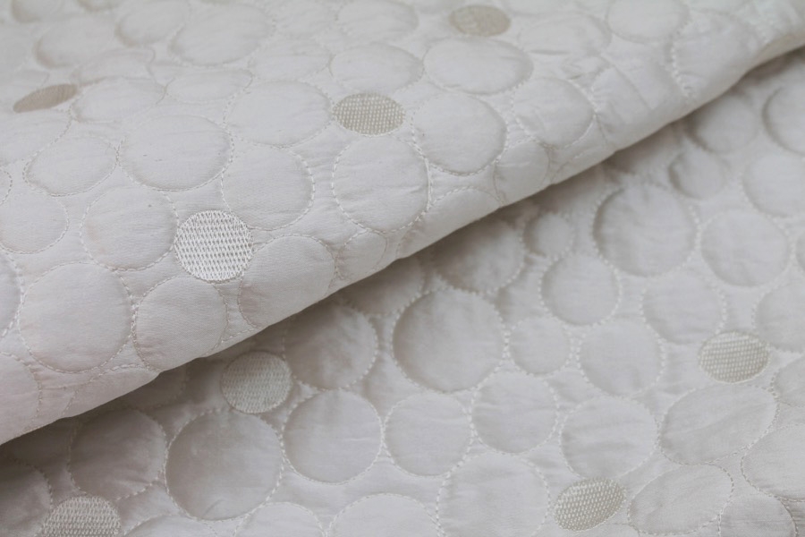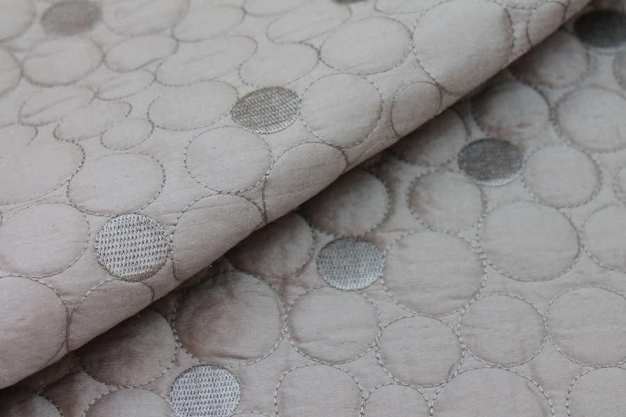 Our 100% silk dupion is woven with a Chinese yarn to give a smoother finish when compared to traditional Indian dupions. This one has been quilted with a layer of wadding and a cotton muslin backing, in a circular pattern where some circles have been embroidered in. Black in colour.
