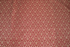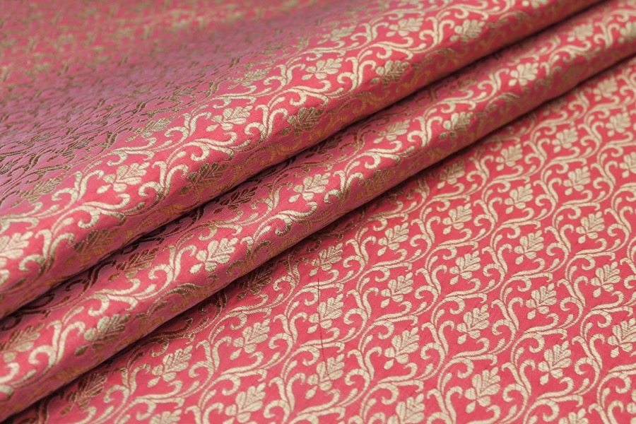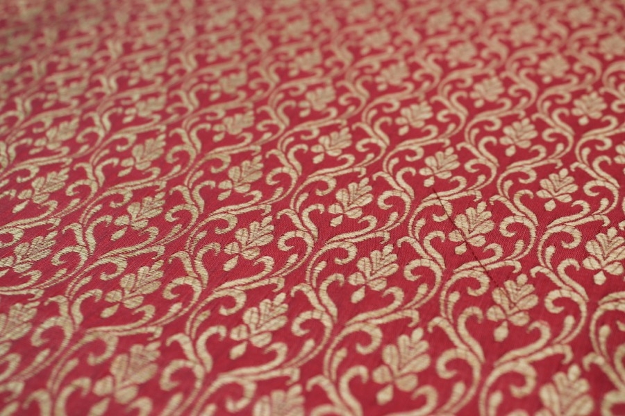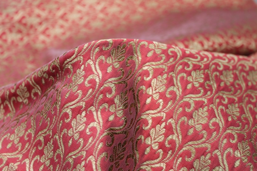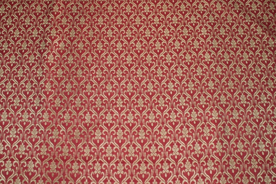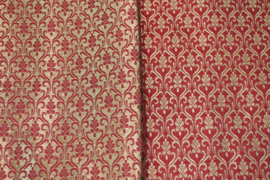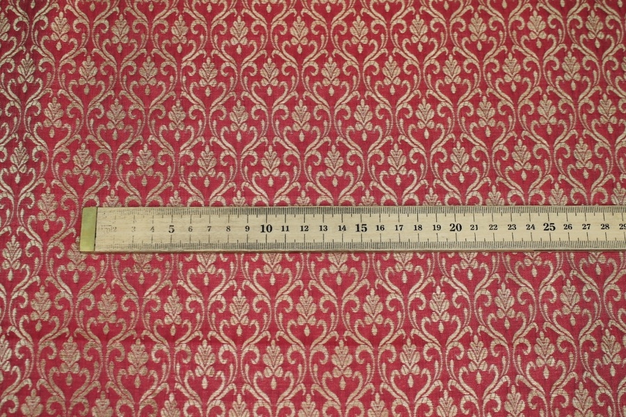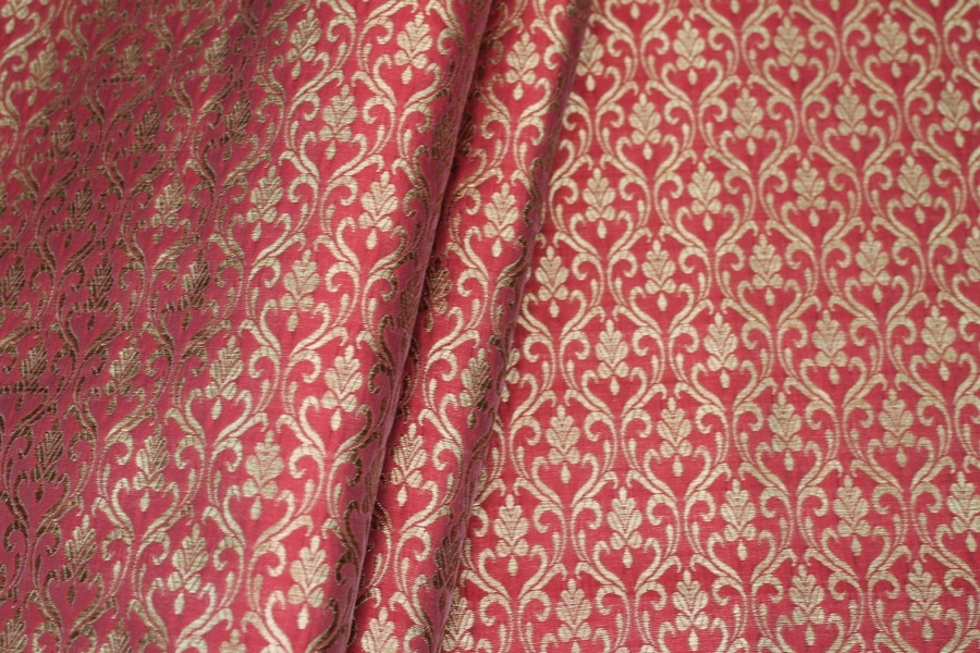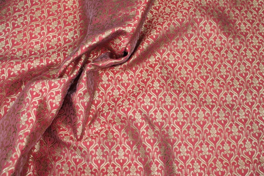 Poly-viscose mix brocade, hand loomed in India. Features a simple but ornamental design in a coral toned red and gold, no metallic thread. The design is somewhat reversible, see all images.