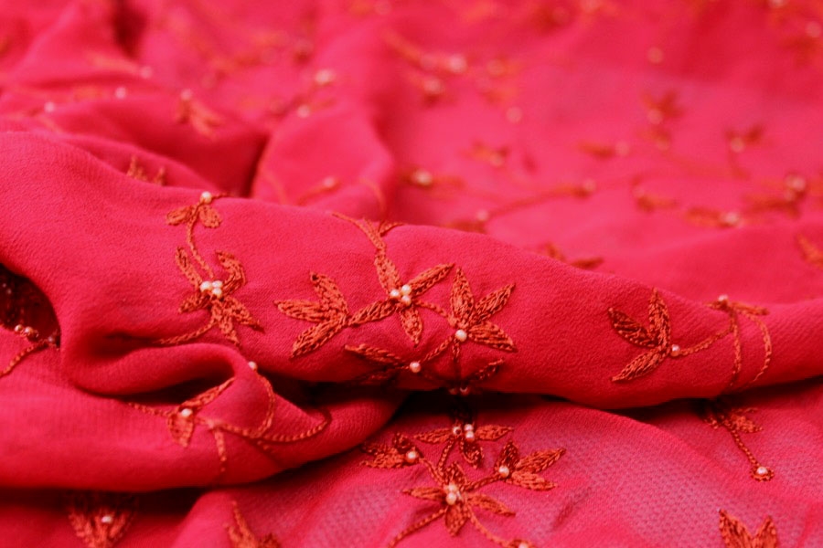 Red embroidered silk chiffon in floral pattern with tiny pearls embellishing the centre of the flowers.