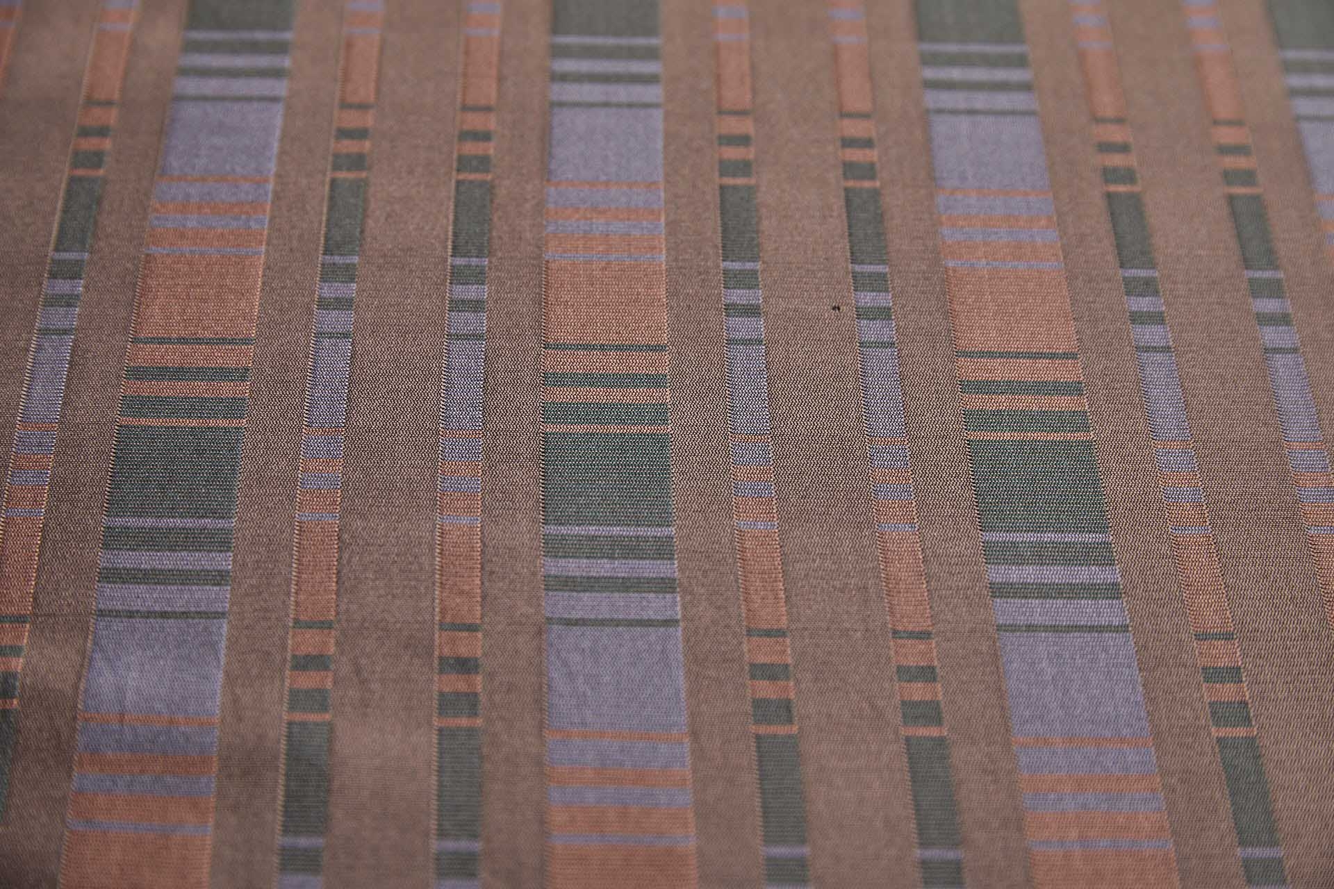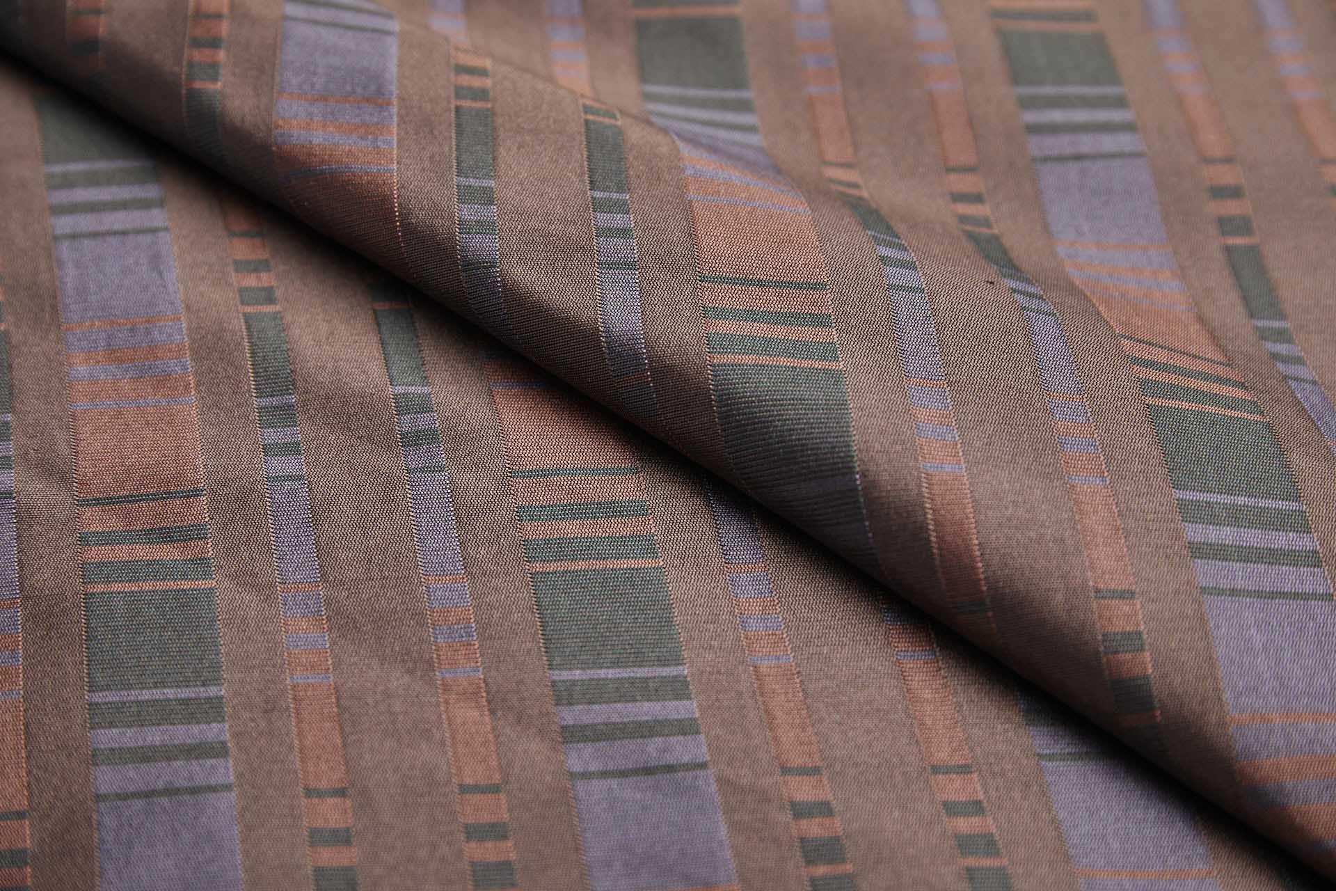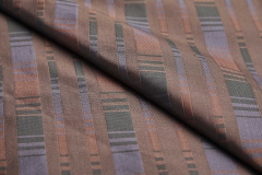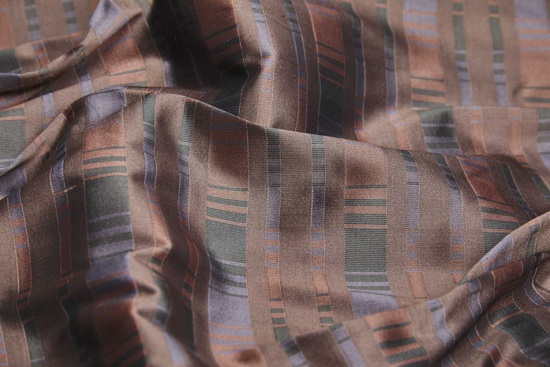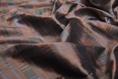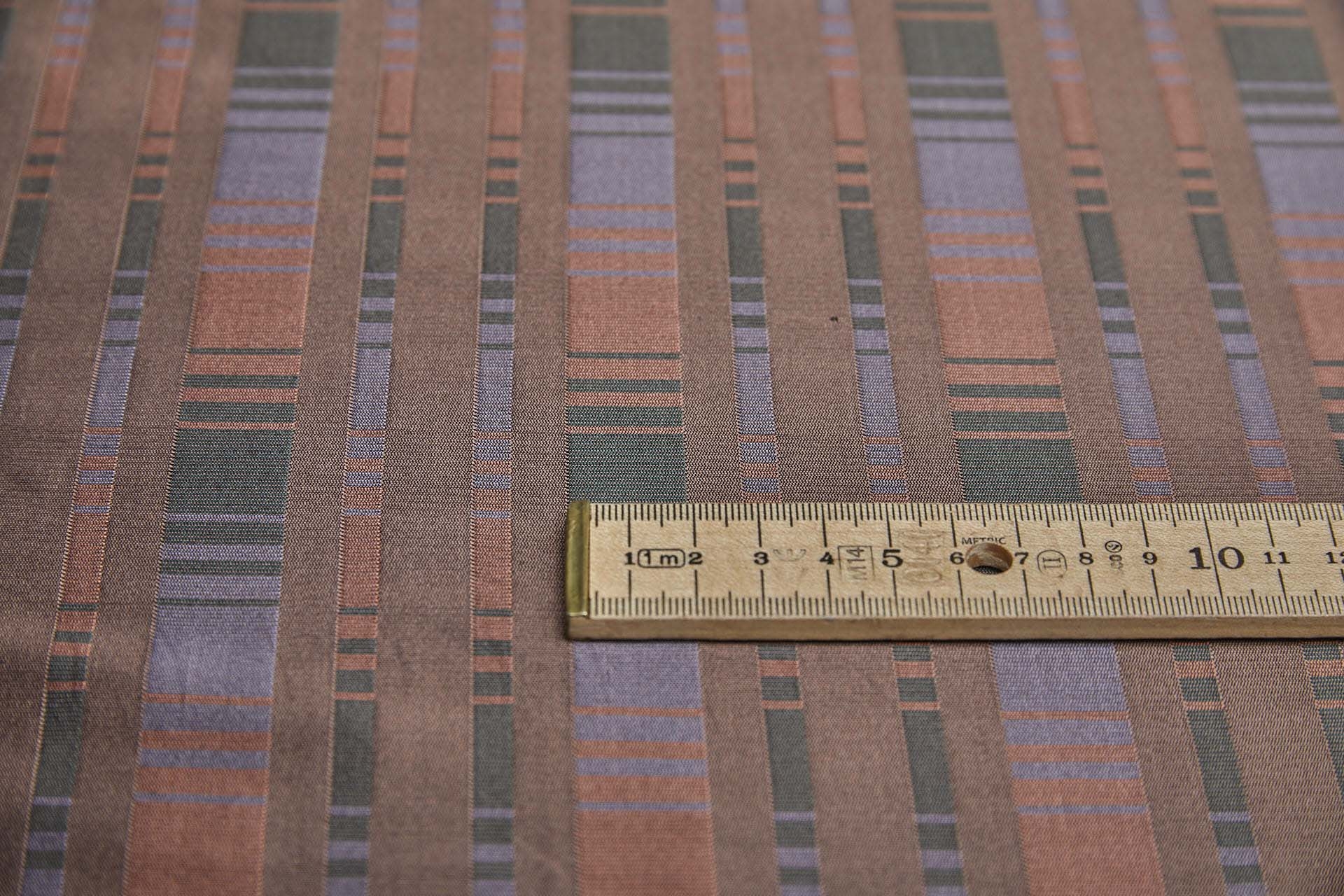 A double sided brocade in fun stripe pattern, woven in coral, blue and green, each side slightly different to the other. Great for furnishings as well as fashion and costumes.