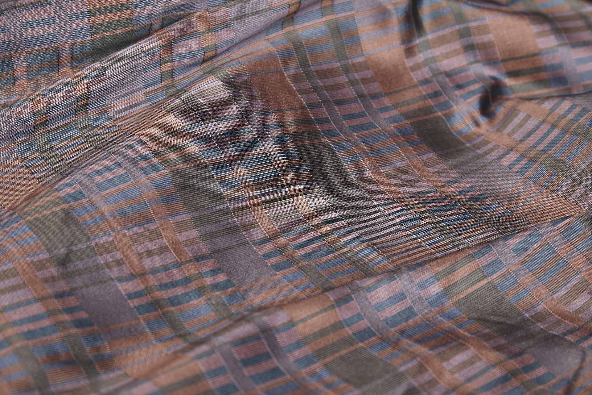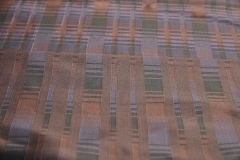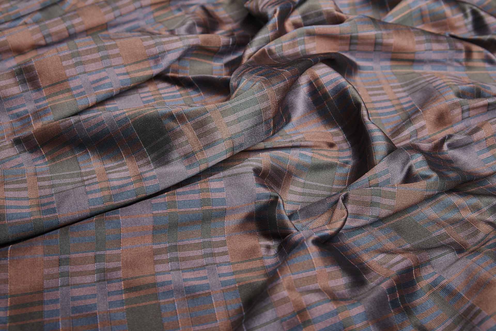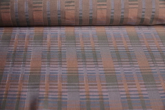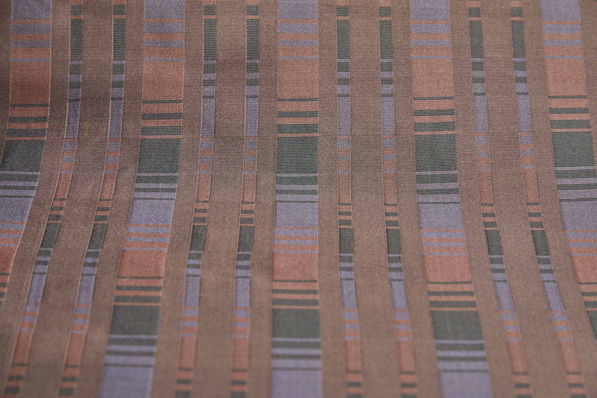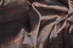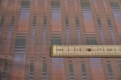 A double sided brocade in fun stripe pattern, woven in coral, blue and green, each side slightly different to the other. Great for furnishings as well as fashion and costumes.