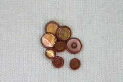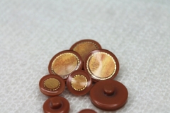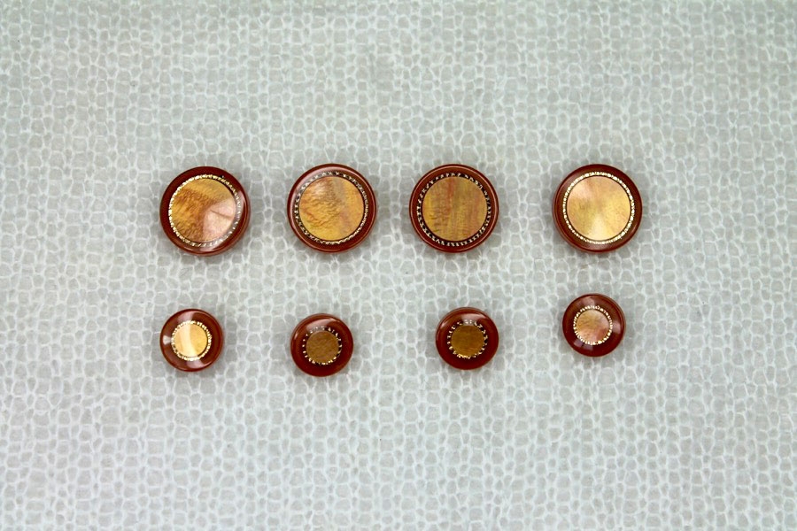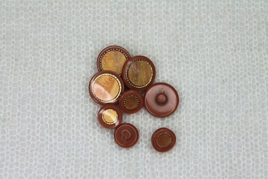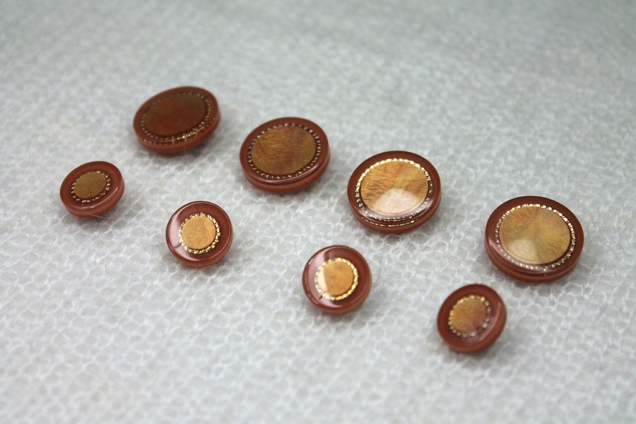This is a vintage style shank button in tan/light brown resin with a simulated pearl resin inlay surrounded by a gold border. Measures about 1.8cm across.