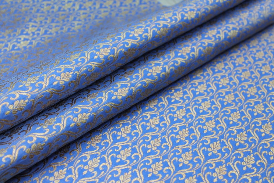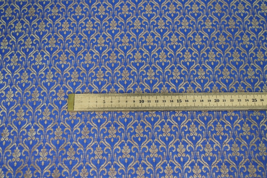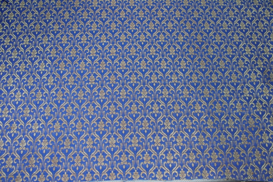 Poly-viscose mix brocade, hand loomed in India. Features a simple but ornamental design in royal blue and gold, no metallic thread. The design is somewhat reversible, see all images.