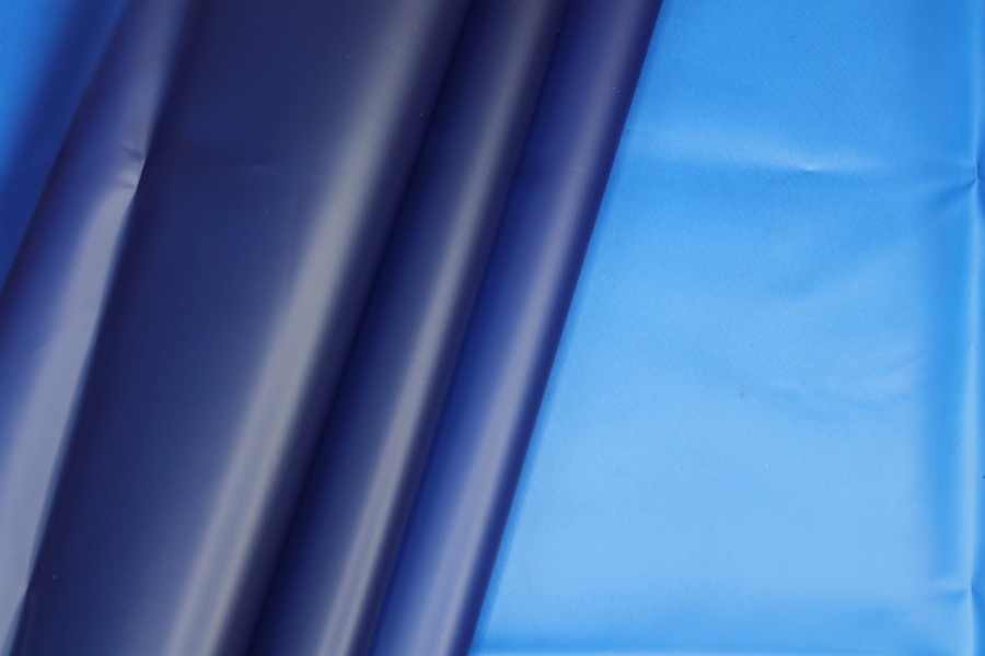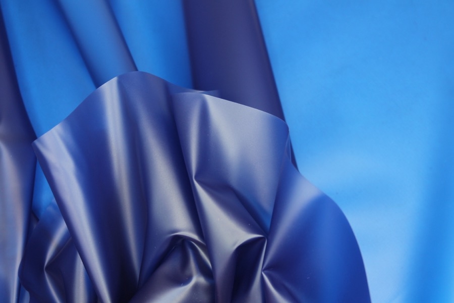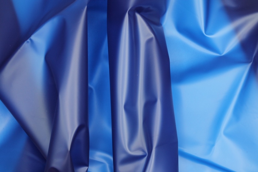Royal blue semi transparent PVC look material, semi-sheer plastic type fabric, made of polyurethane, non-woven and thermoplastic. 130cm wide.