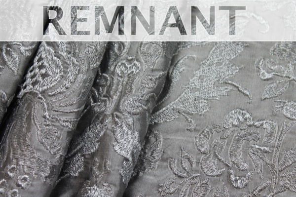This is a remnant piece of a beautiful silk dupion base in silver with a detailed jacquard style silver metallic embroidery.