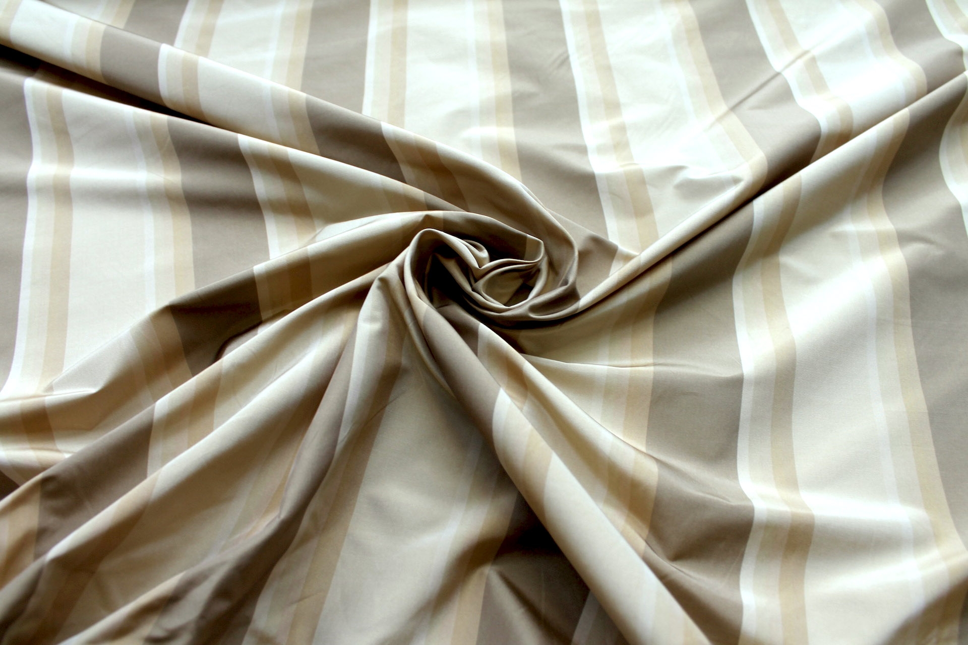This is a pure silk taffeta with alternating wide and narrow stripes in shades of pale gold, sand and light brown.