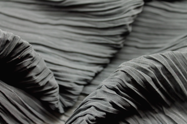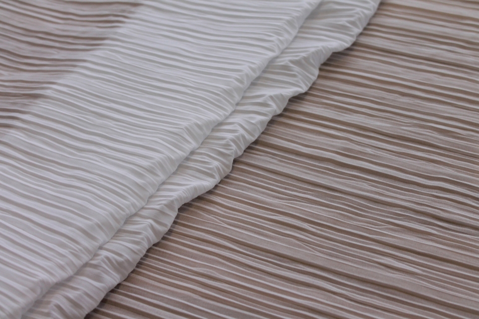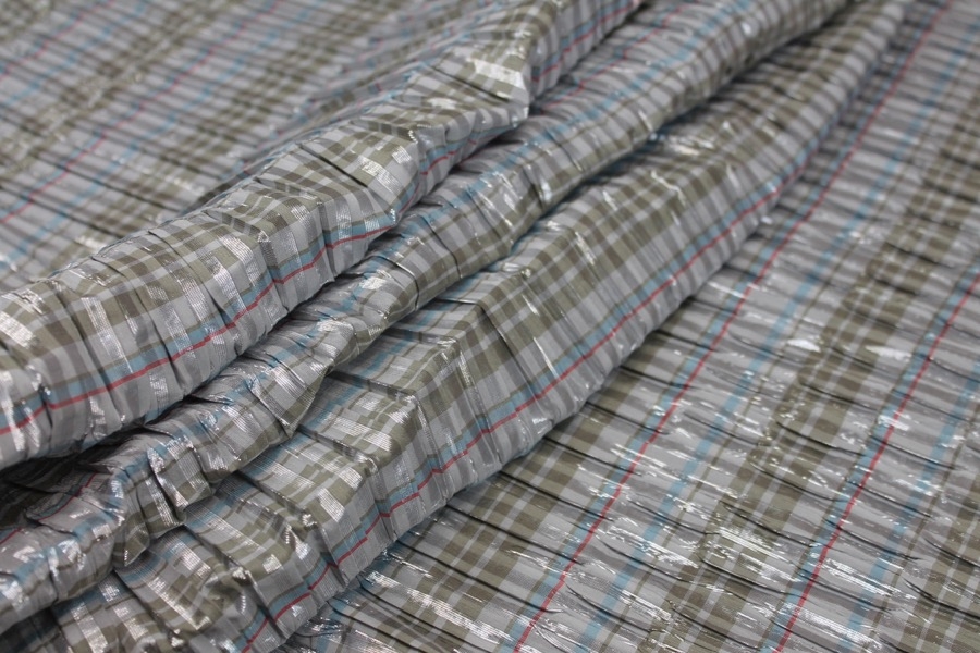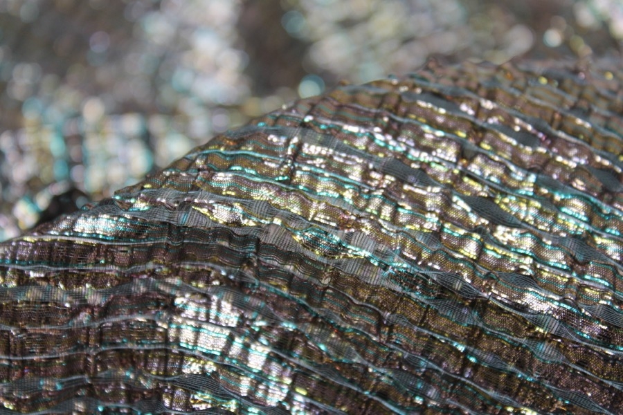 A European made woven lurex taffeta that has a seersucker style pleat from selvedge to selvedge. This one is grey, sage green, blue and coral in stripes running the length of the fabric.