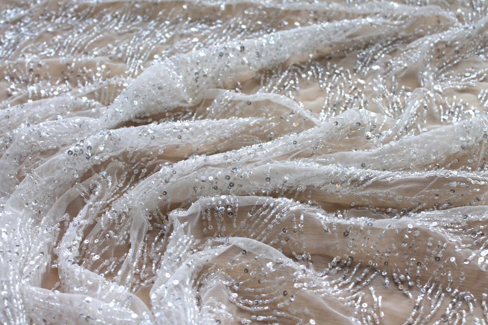 This is an ivory silk chiffon completely encrusted in tiny cupped or coned whiter ivory sequins in dense swirls, creating a textured effect with a paler white/ivory look.