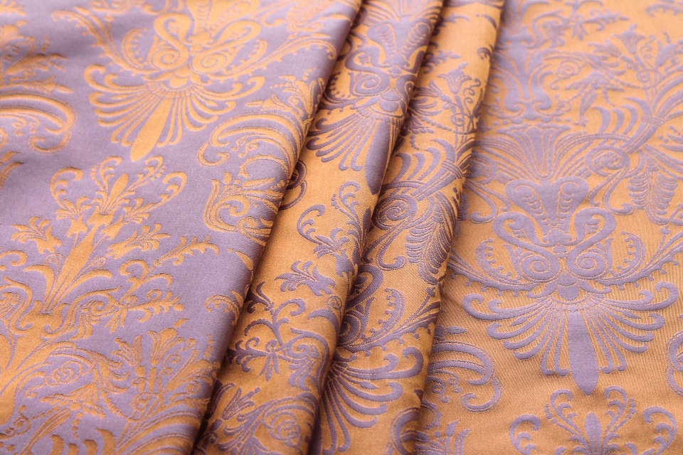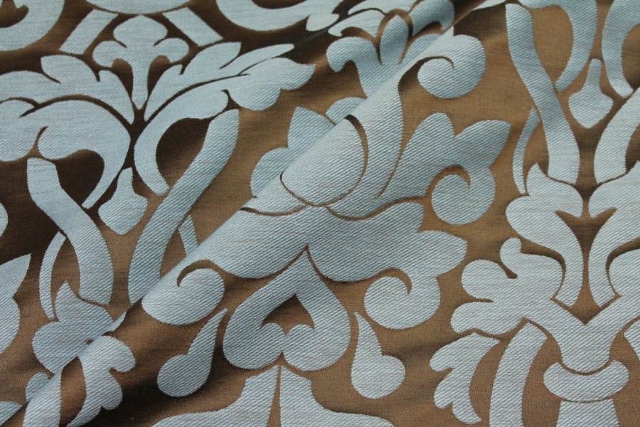 100% silk brocade featuring a large scale stylized floral design in black, gold and turquoise.