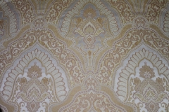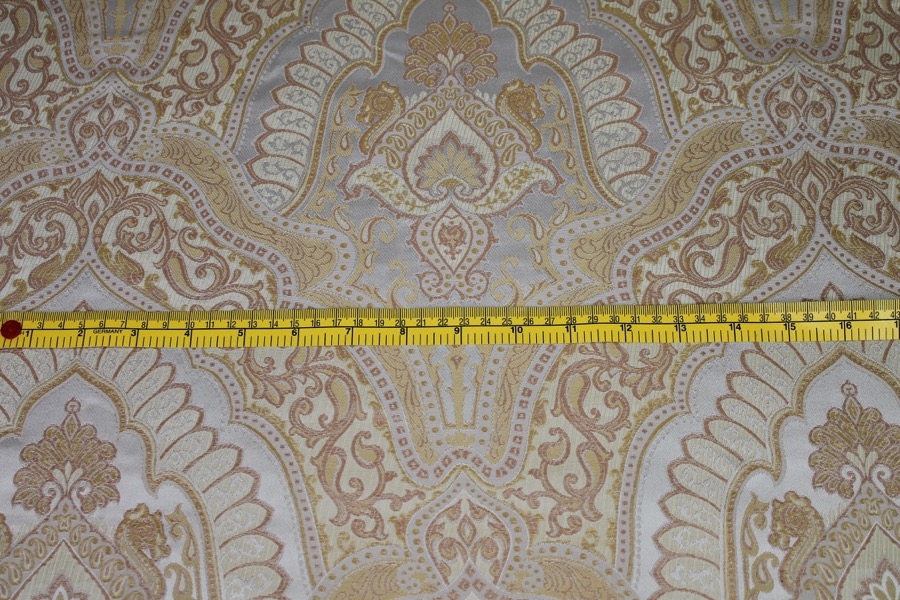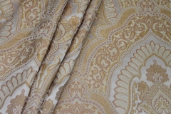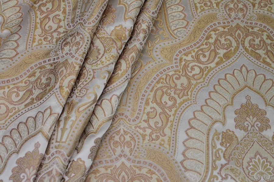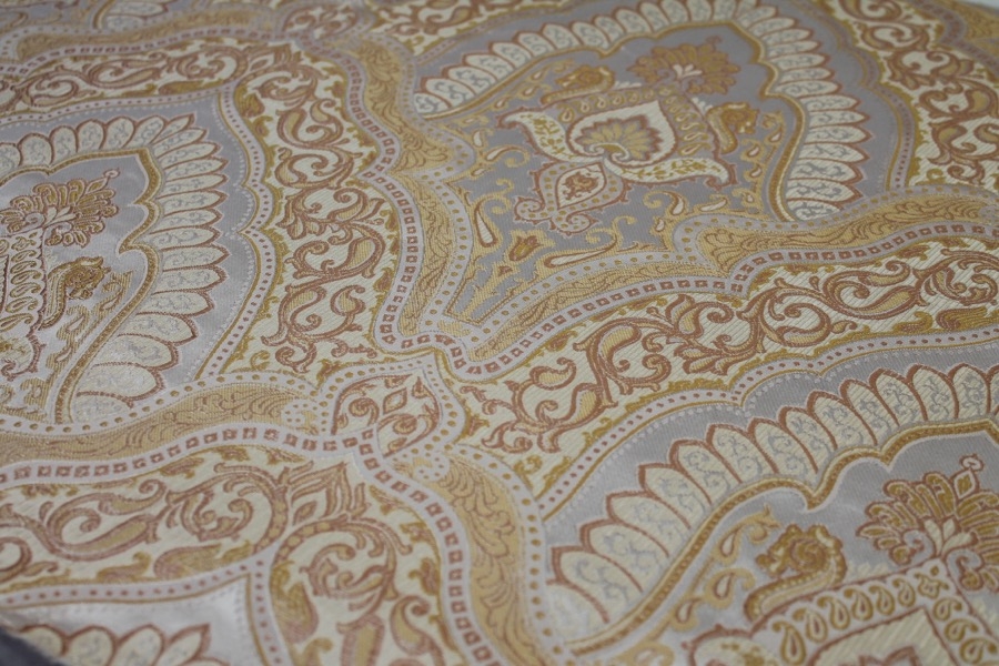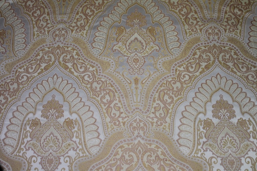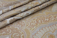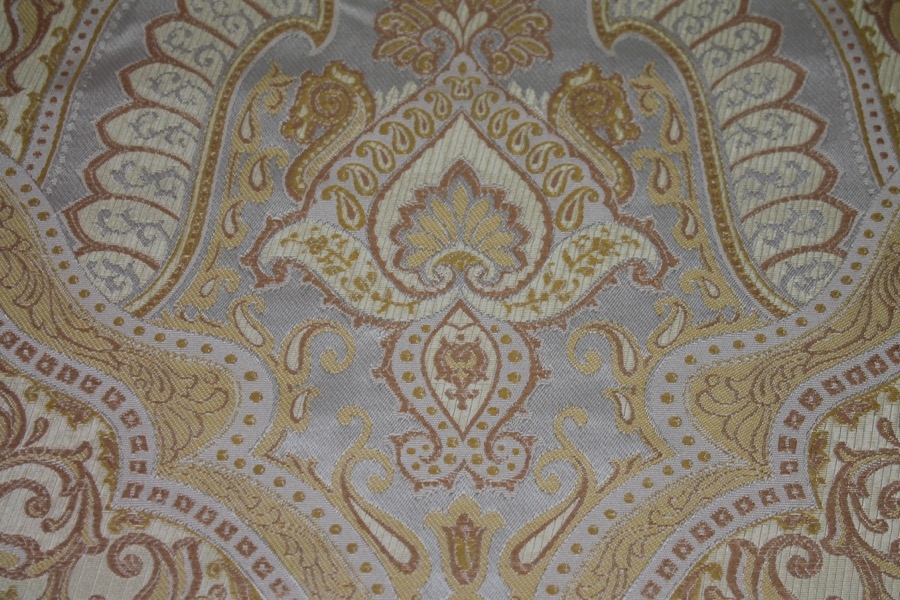 A lovely large scale silk brocade in a mandala like pattern, woven in a warm gold and an off-white shade.