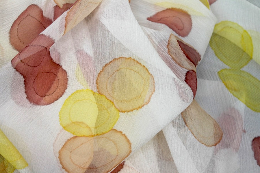 A soft silk chiffon in ivory with a fun pattern resembling ink droplets in reds and yellow. 100% silk, 110cm wide.