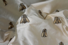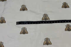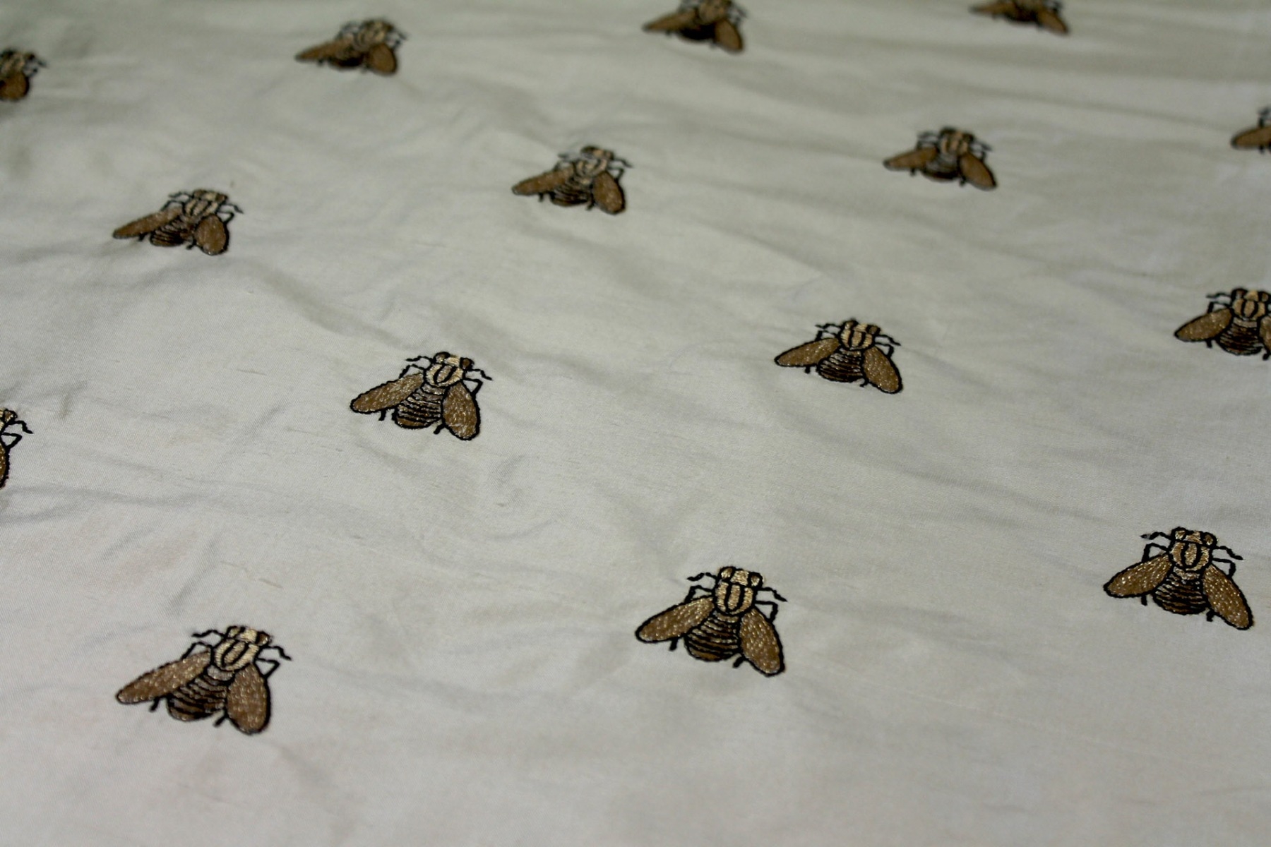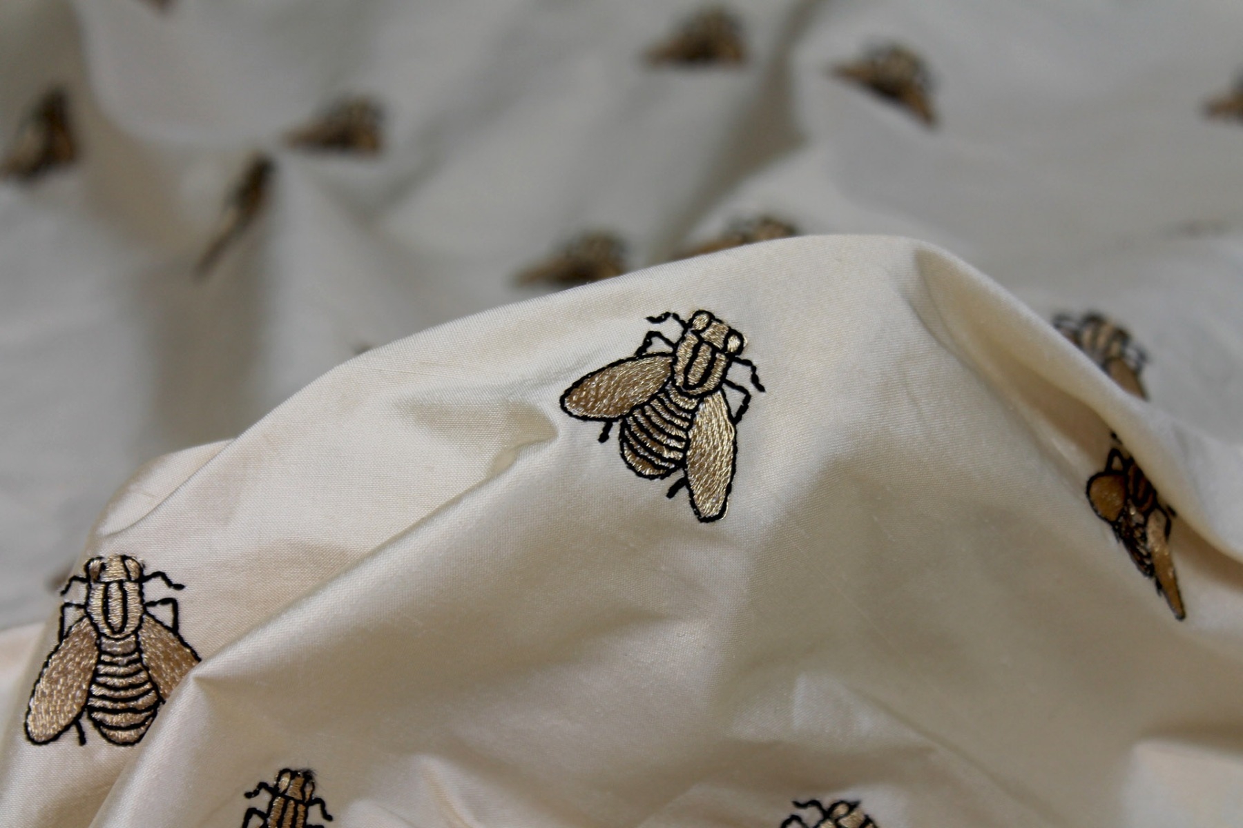 A silk dupion base in a rich cream colour, embroidered with bees in gold metallic thread with black detailing.