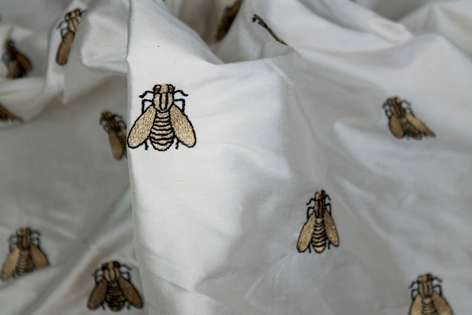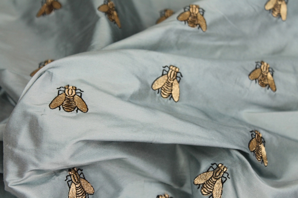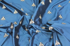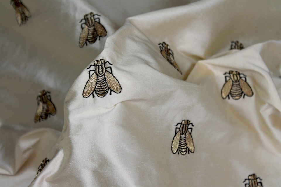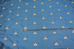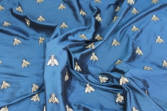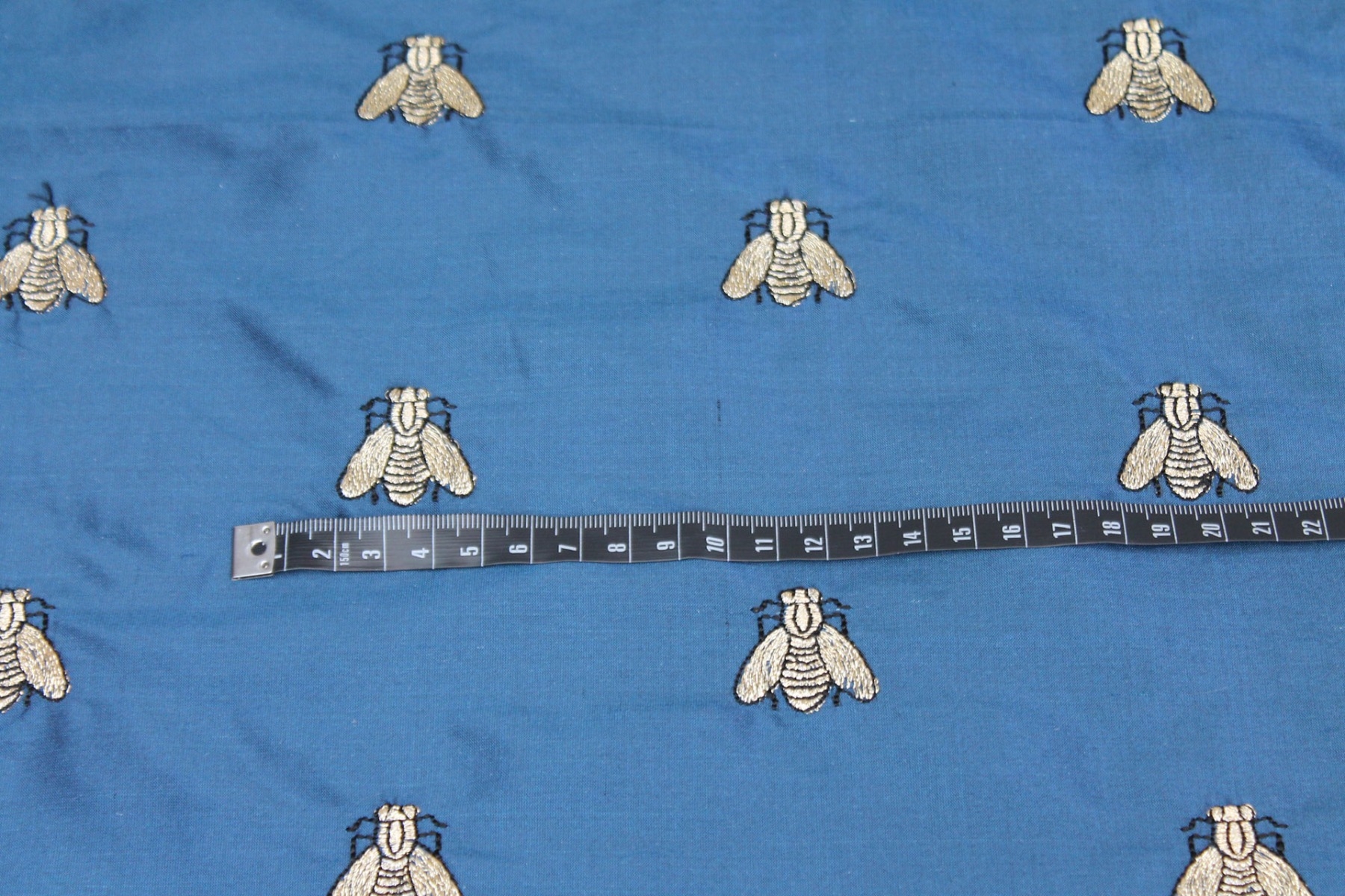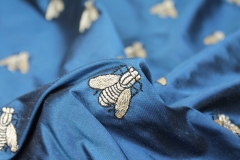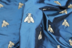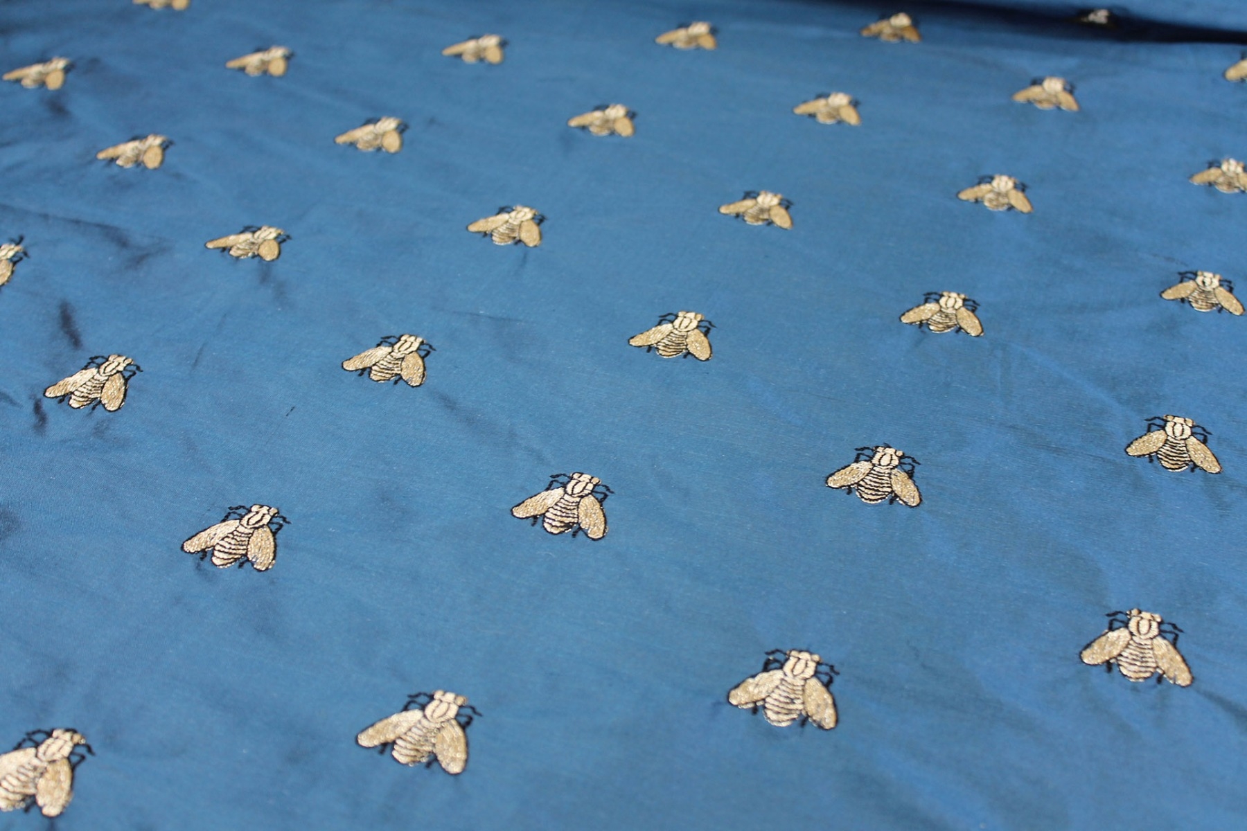 A silk dupion base in a dark blue, embroidered with bees in gold metallic thread with black detailing. B59 is the plain to match.