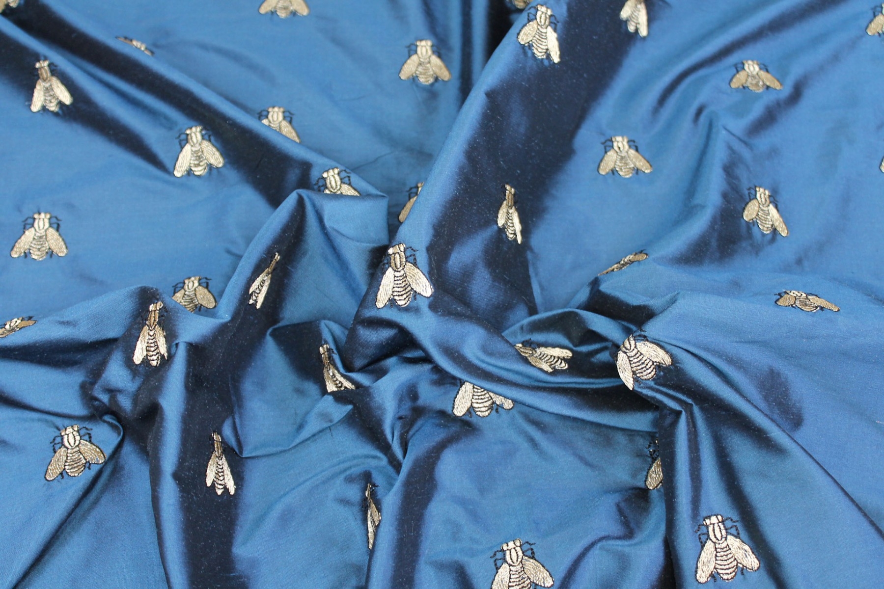 Silk Dupion Embroidered with Bees - Dark Blue / Gold