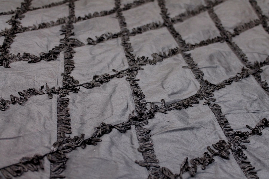 A silk dupion base in black, pintucked and stitched into a harlequin check pattern, with matching fringe stitched into the pintucks. 112cm wide.