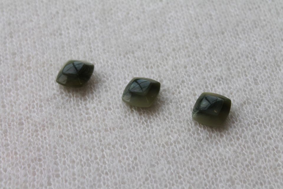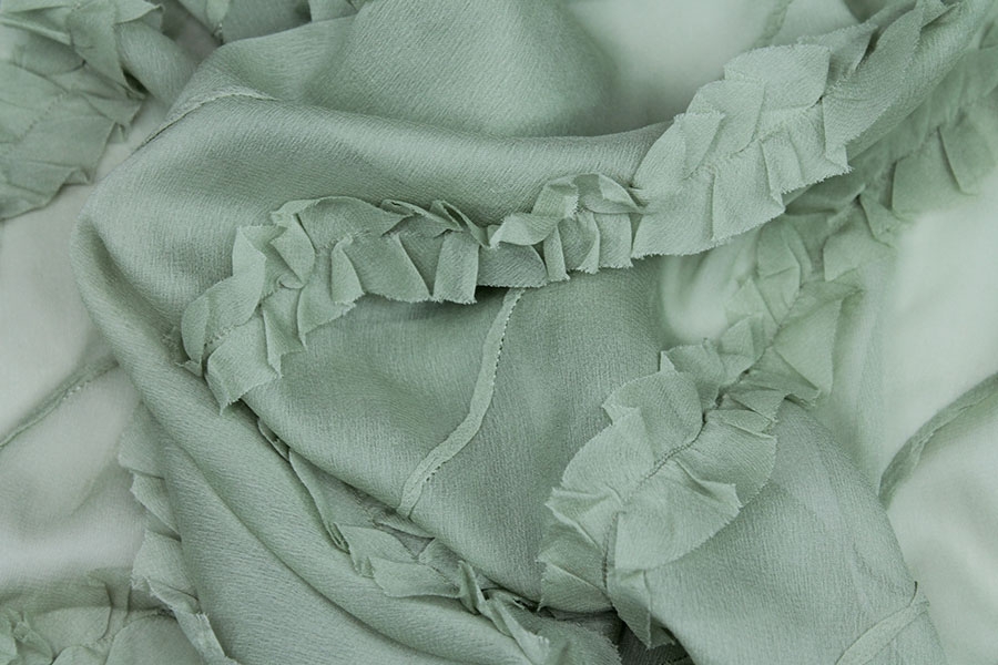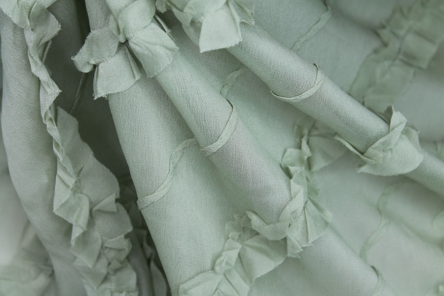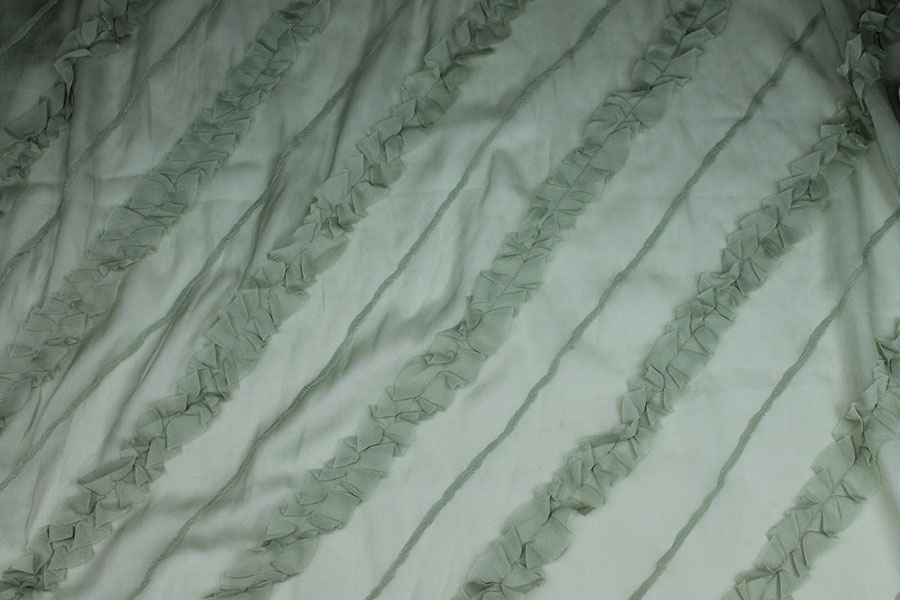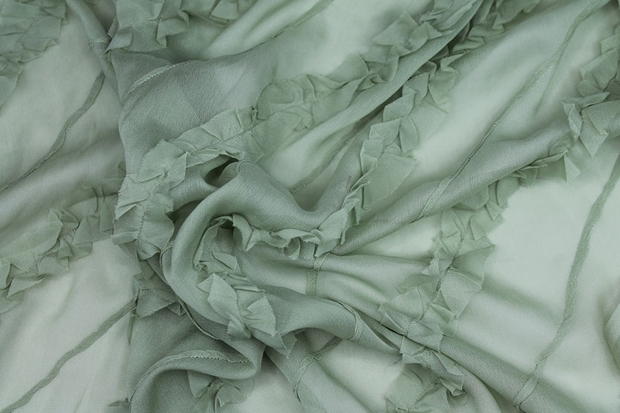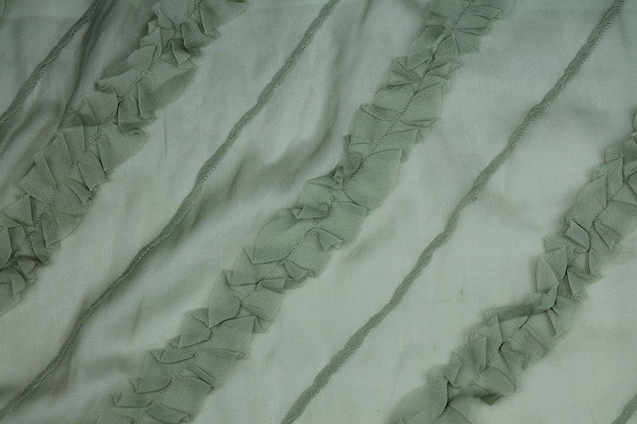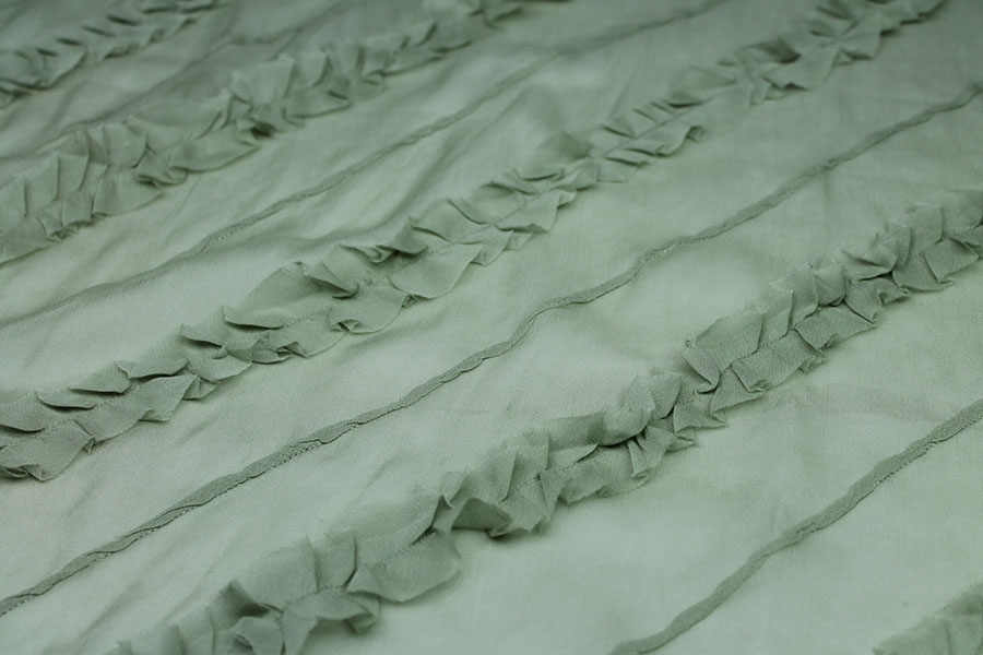 Sage green silk georgette wit alternate pin tucks and frills in the same fabric stitched on in diagonal rows from selvedge to selvedge.