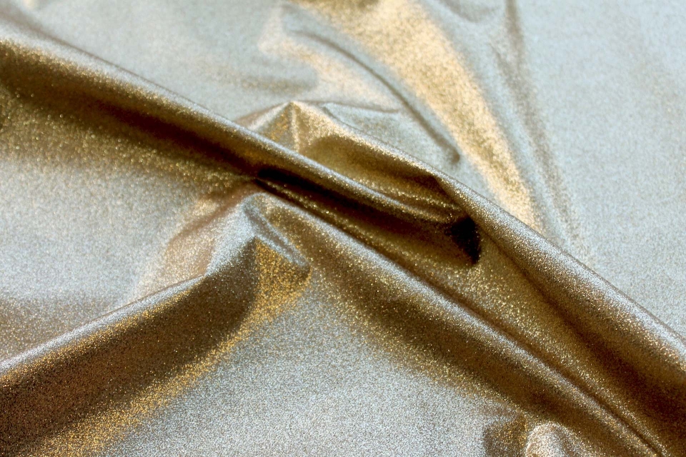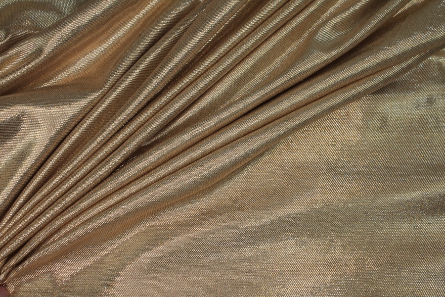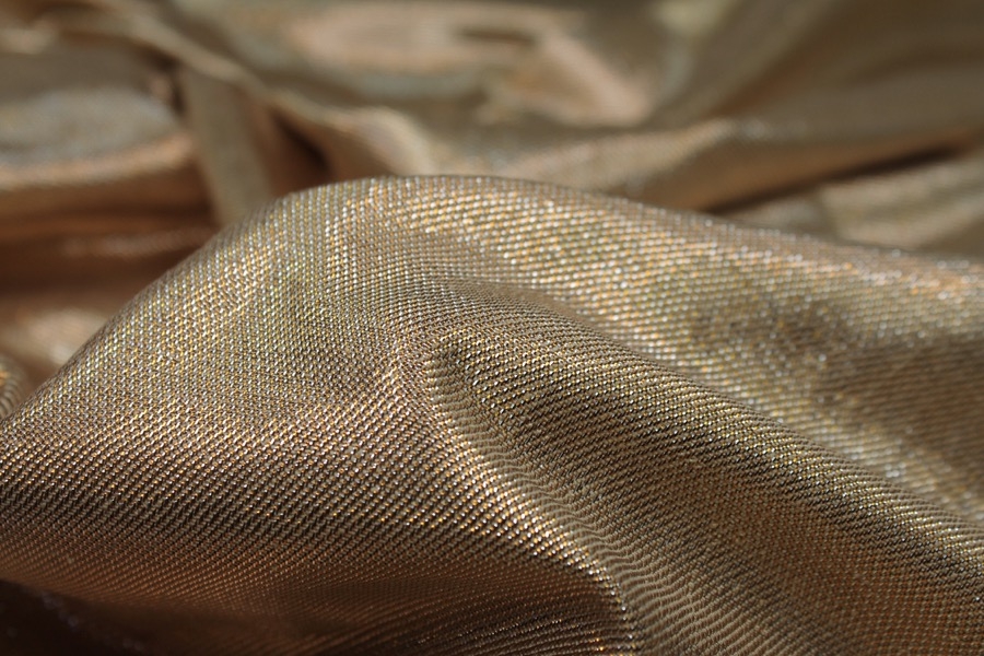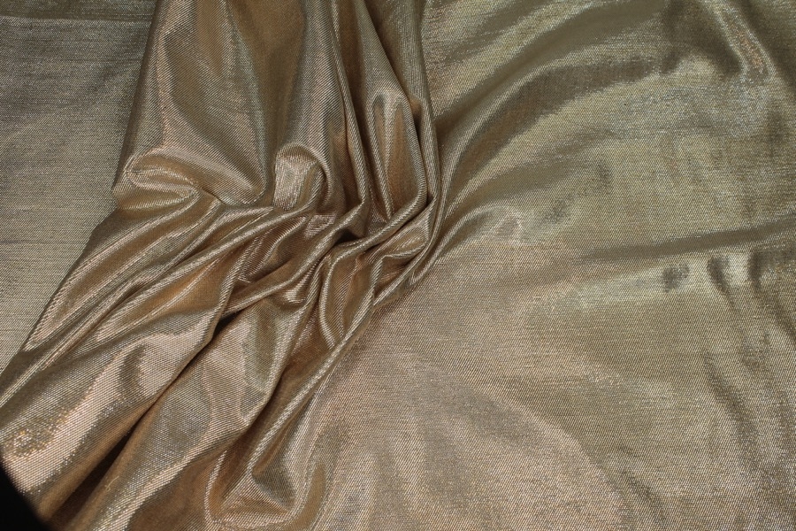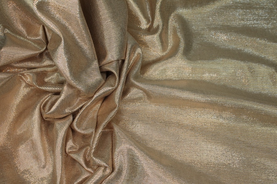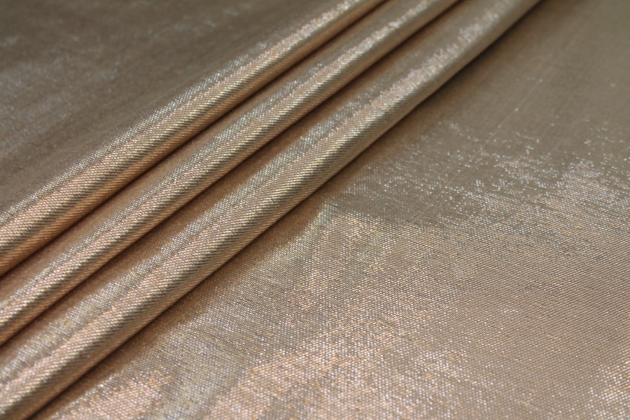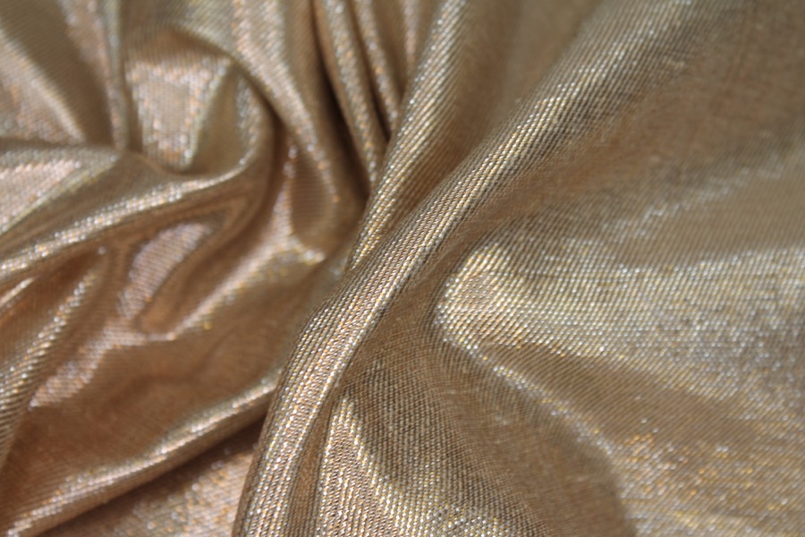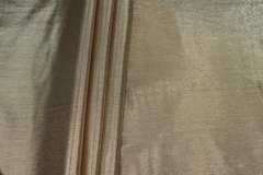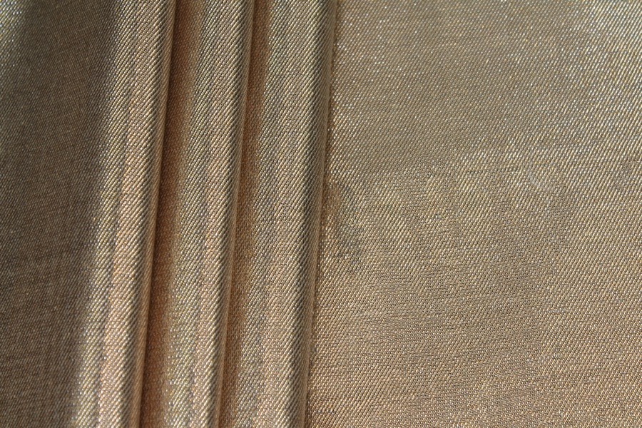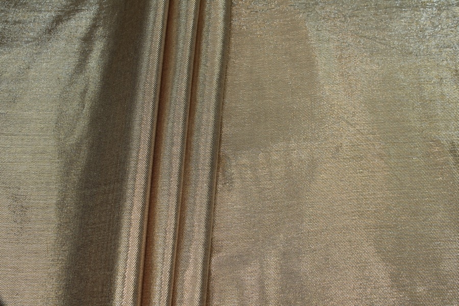 A silk and lurex mix twill weave, the warp threads are gold lurex and the weft threads cream silk, giving off a lovely metallic two-tone effect. The silk threads used have a crisper finish.