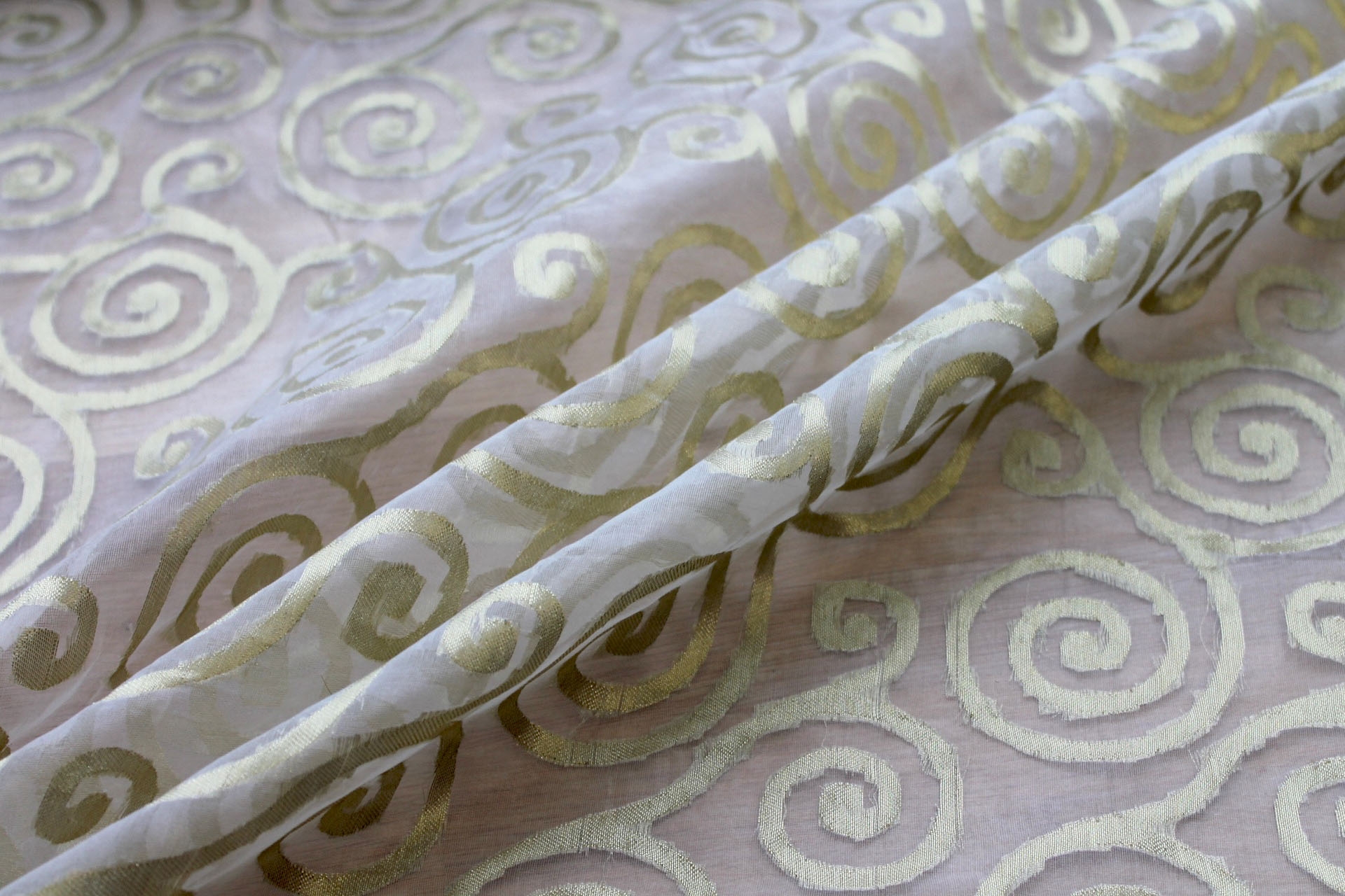 A sheer, structured organza in ivory with metallic gold swirls woven into it. 100% silk.