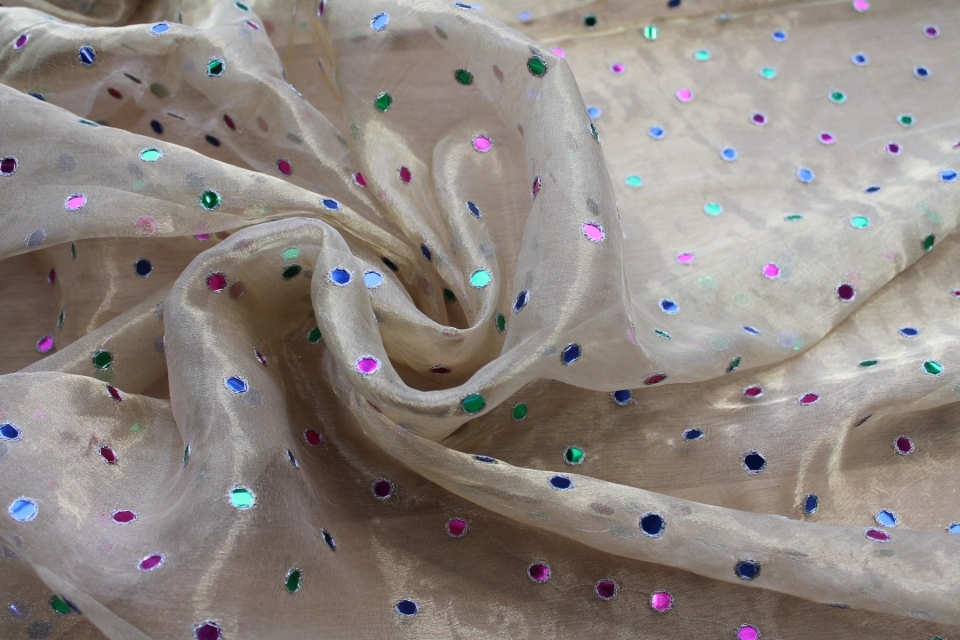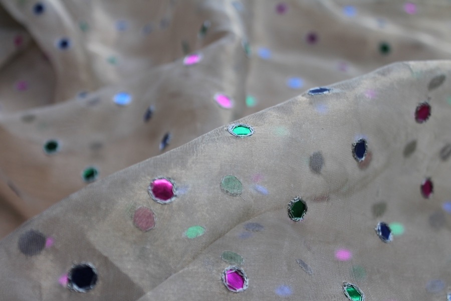 A sheer, structured organza in silver metallic with plastic mirrors in green, blue and pink sewn onto it with silver metallic thread.