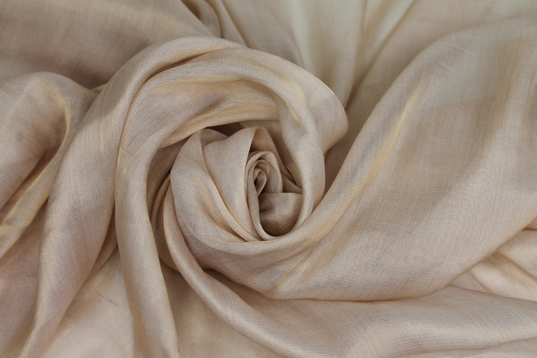 A high quality, fine silk and metal chiffon in off white, the golden metallic threads give it a slight ripple effect.