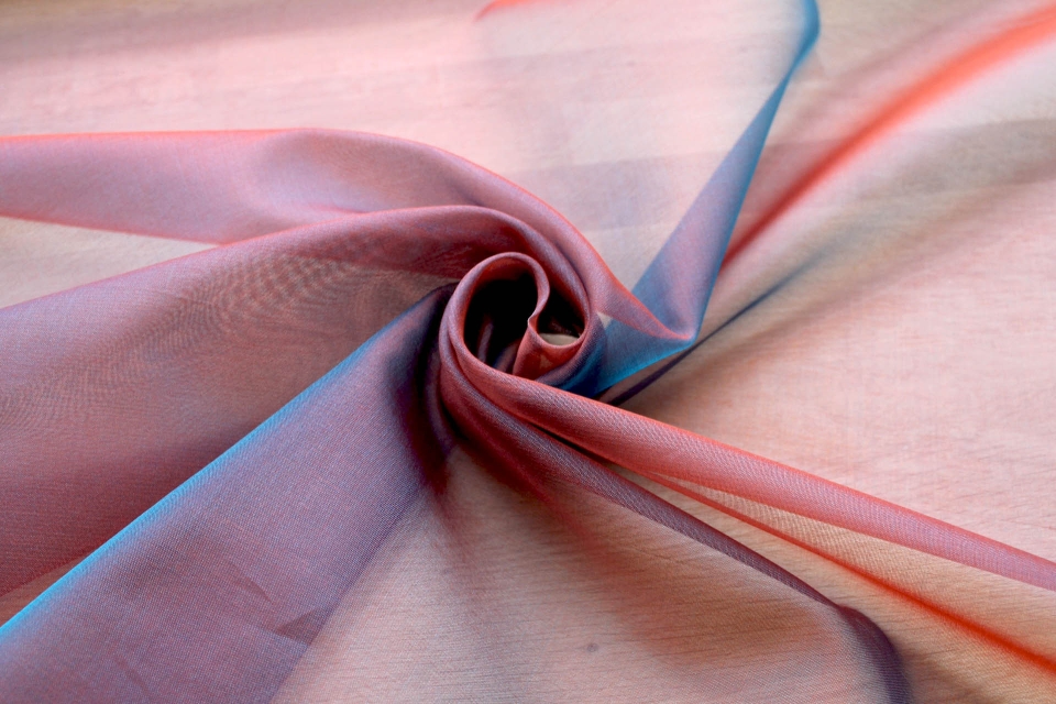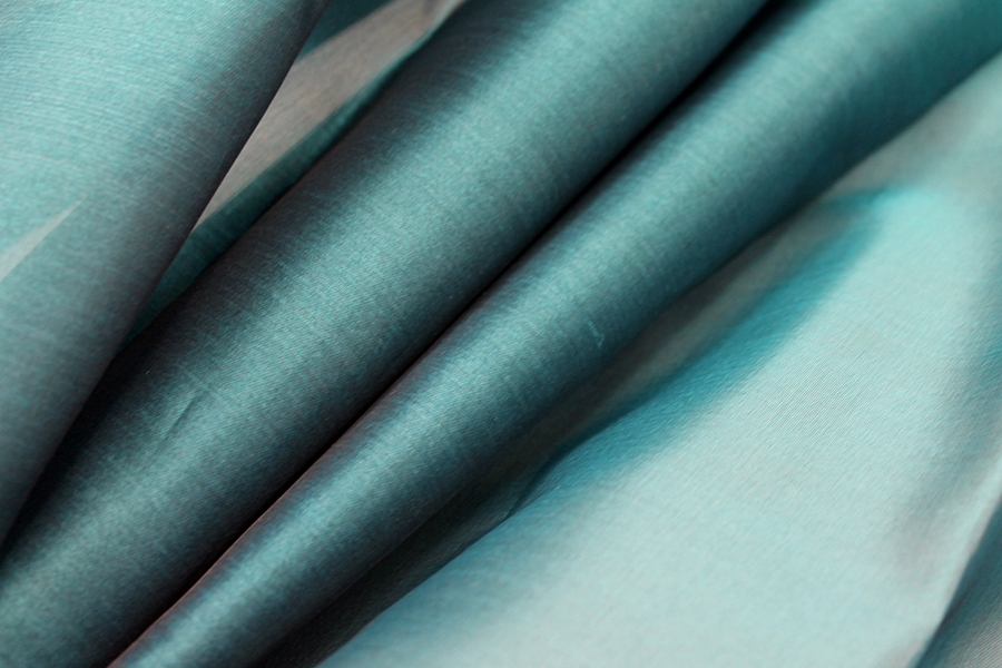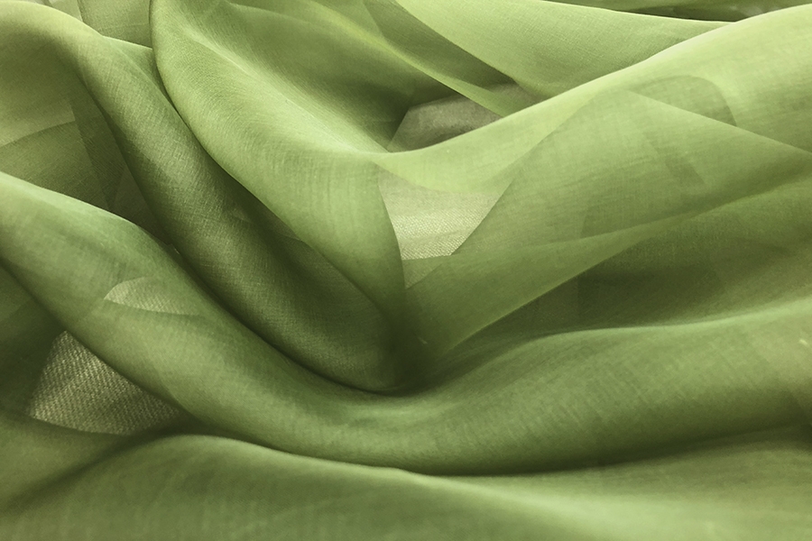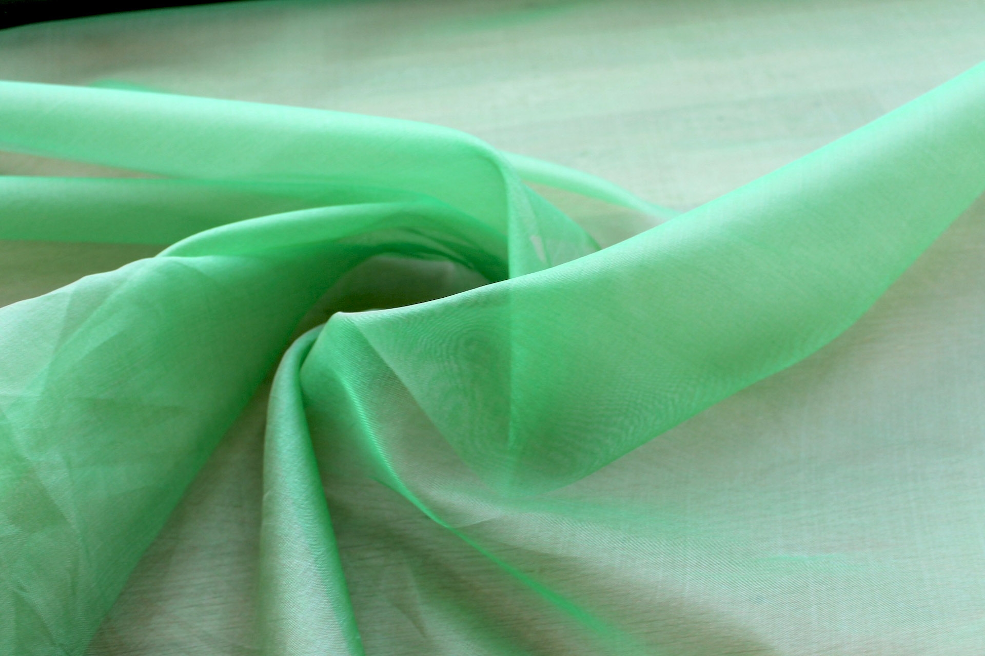 A sheer, structured organza in soft apple green. This is a 'shot' (two tone) organza made from apple green and pale blue silk yarns. 100% silk.