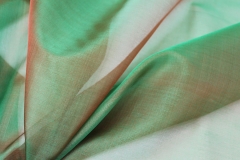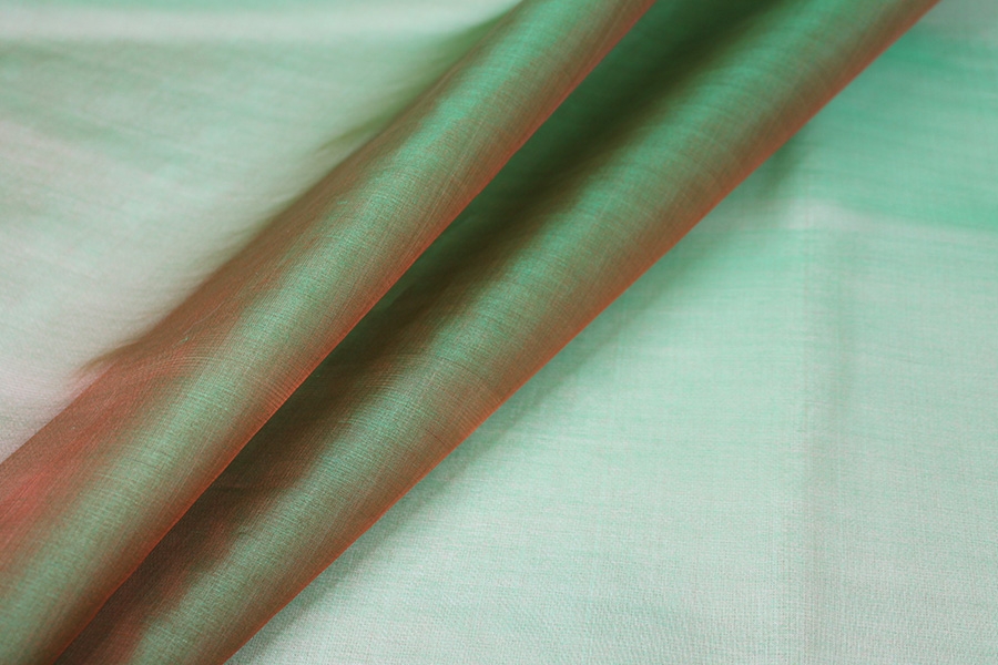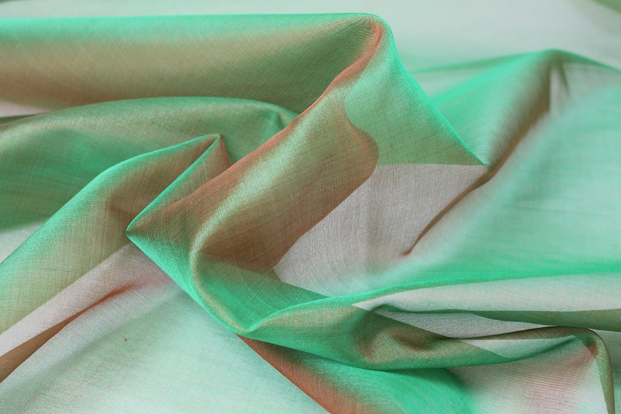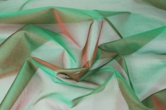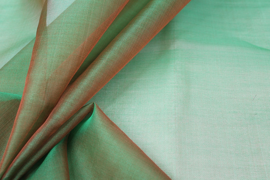 A sheer, structured organza in emerald green shot deep orange. This is a two tone organza made from green weft and orange warp yarns. 100% silk.