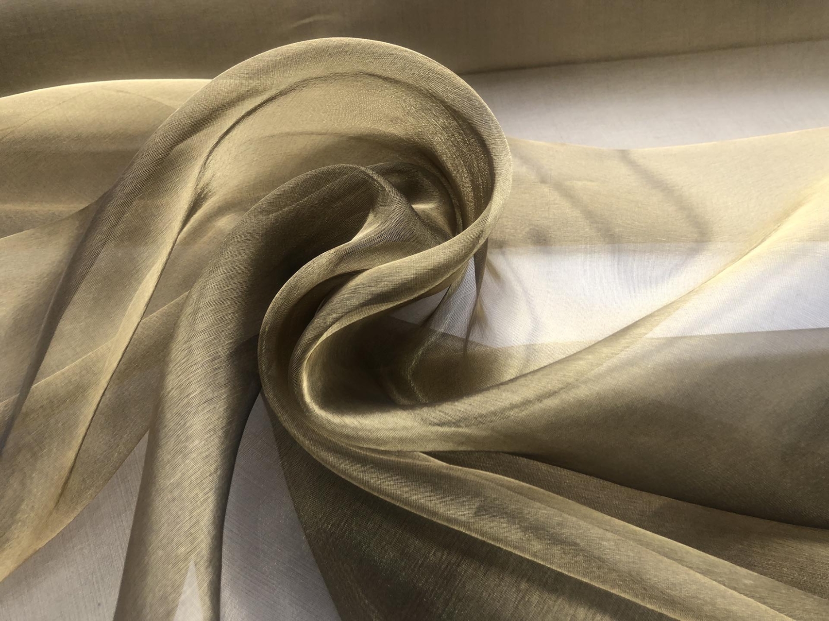 A sheer, structured organza in black gold. This is a 'shot' (two tone) organza made from black silk yarns and gold metal yarns. 52% silk, 48% metal.